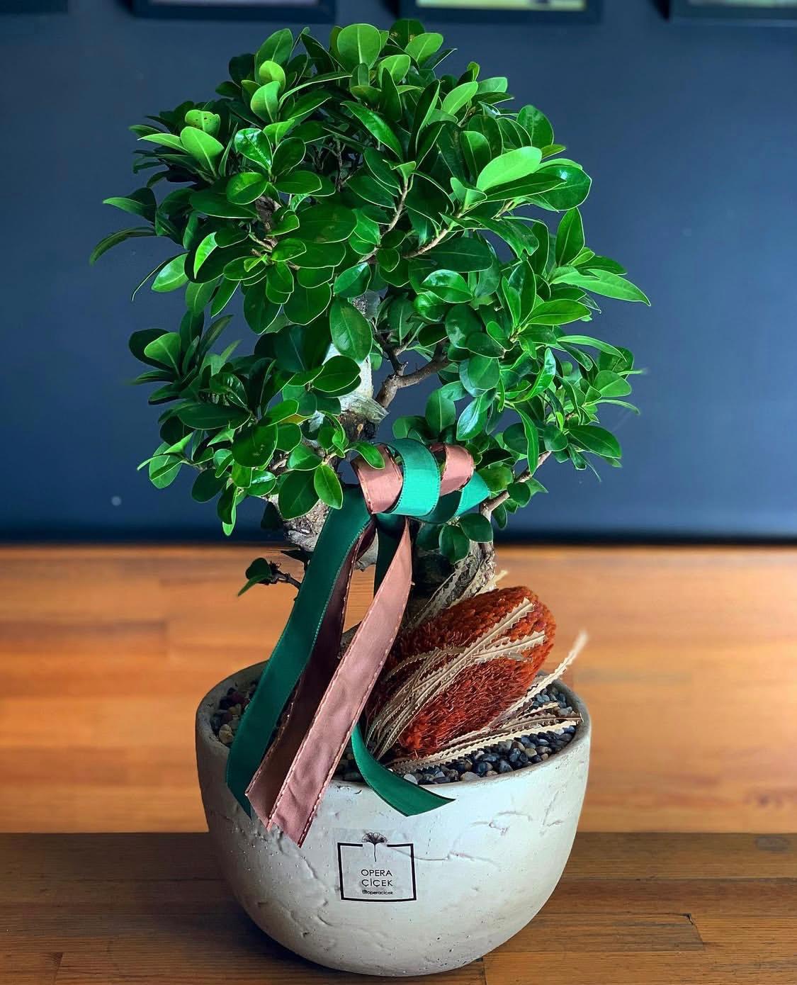 İçerik ve Renkler: Şekilli gövdesi ve canlı yeşil yapraklarıyla Ficus Ginseng (Bonsai) ağacı.