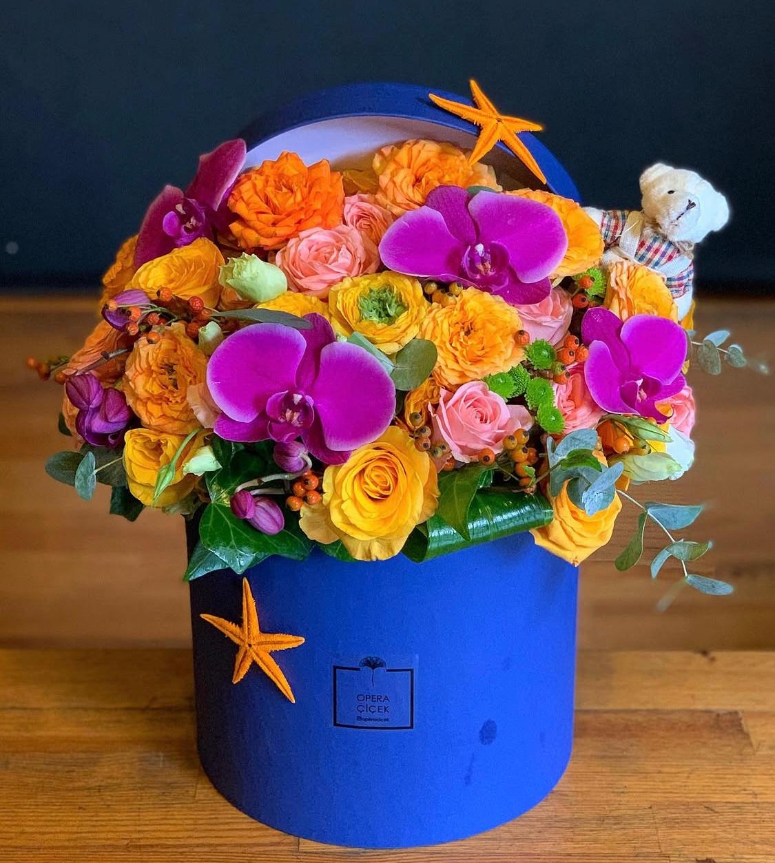 Diese besondere Box, gefüllt mit einem süßen Teddybären und bunten Rosen, eignet sich perfekt für kleine Überraschungen! Sie ist die perfekte Begleitung zu einem fröhlichen Fest oder einer süßen „Ich denke an Dich“-Nachricht.