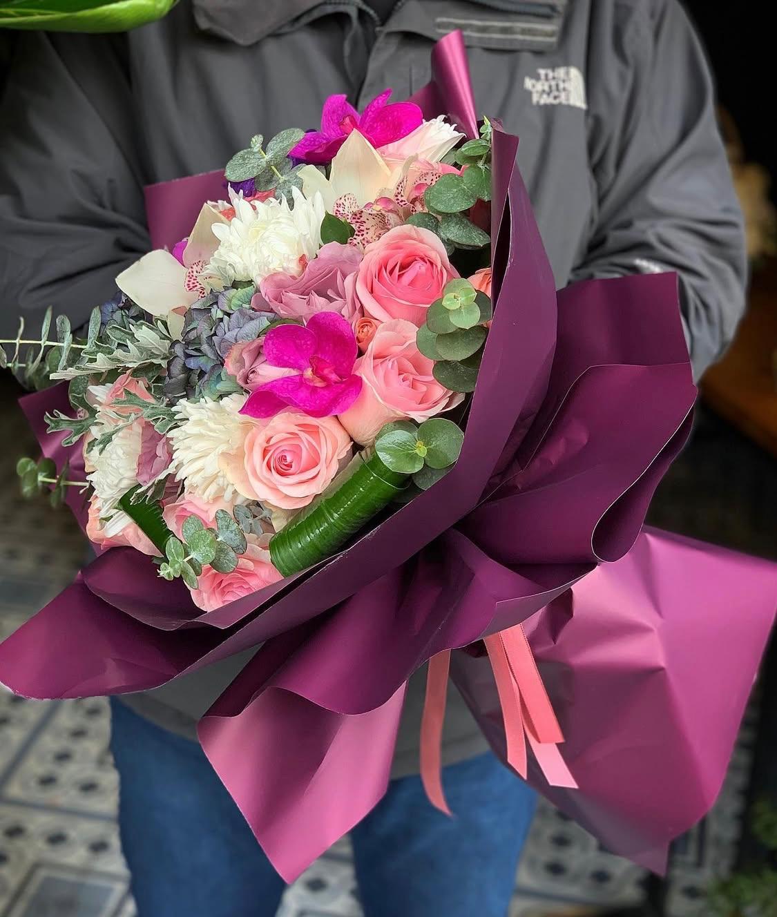 Dieses elegante Design mit zartrosa, cremefarbenen und weißen Rosen, die mit winzigen lila Blüten tanzen, ist wie das süßeste „Ich liebe dich“ von Herzen.