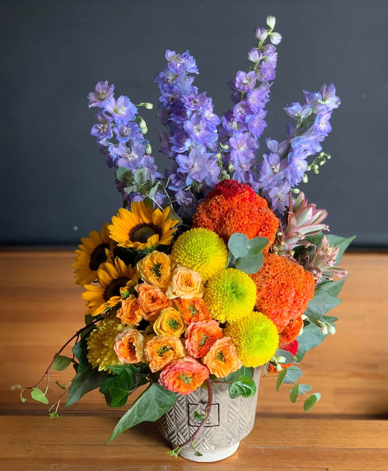 Rainbow Joy besticht durch eine bezaubernde Harmonie aus orangefarbenen Rosen, lavendelfarbenen Ritterspornen und exotischen Pflanzen. Ideal für Geburtsgrüße, Feiern oder besondere Anlässe – dieses Arrangement ist perfekt für alle, die eine anregende Atmosphäre schaffen möchten.