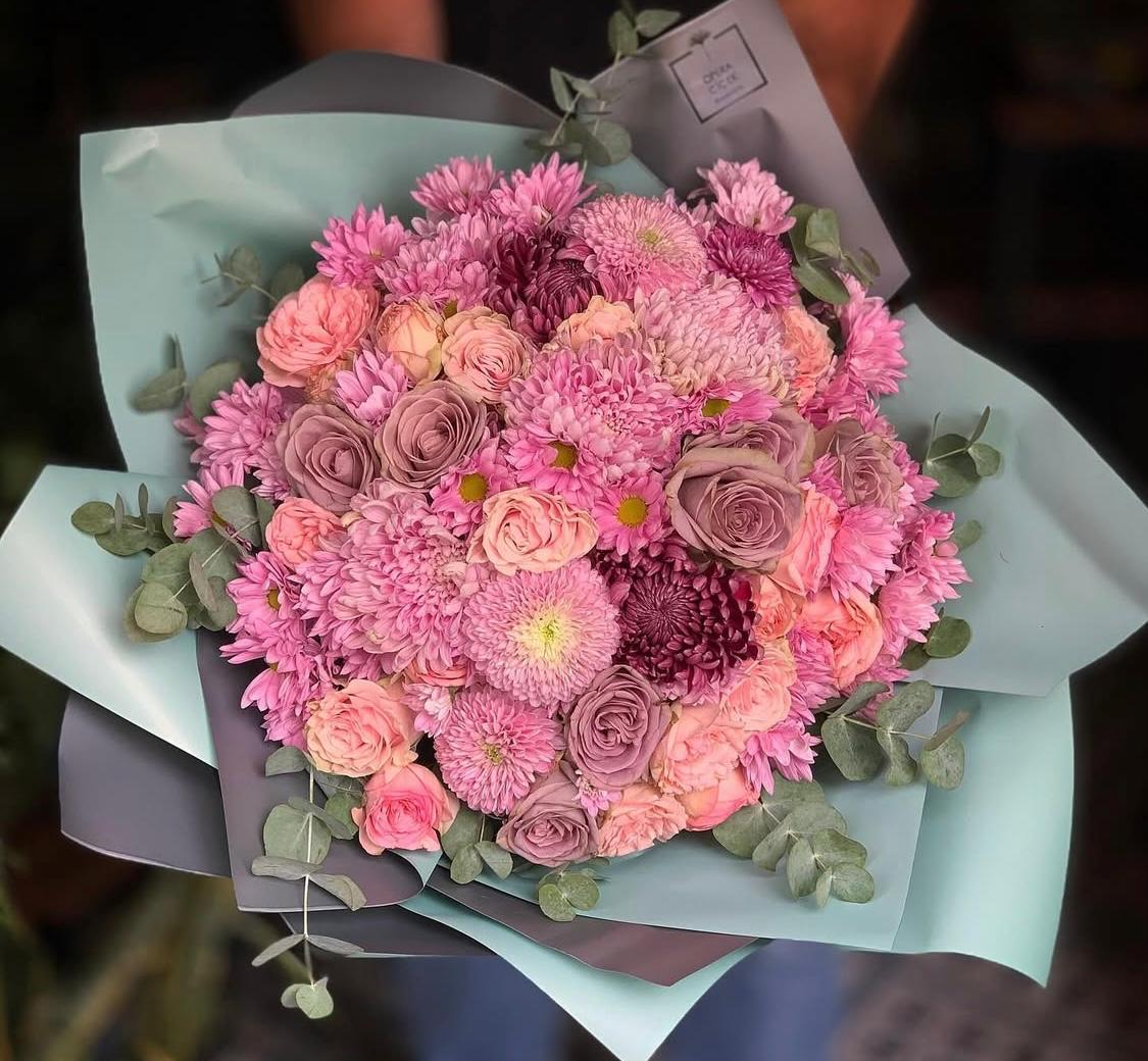 Romantizmin ve zarafetin çiçek hali.Gül, krizantem ve papatya çiçeklerinden oluşan bu yoğun pembe buket, yumuşak geçişli tonlarıyla duygularınızı en zarif şekilde ifade eder. Doğum günü, yıldönümü ya da sadece sevginizi göstermek için harika bir seçim.