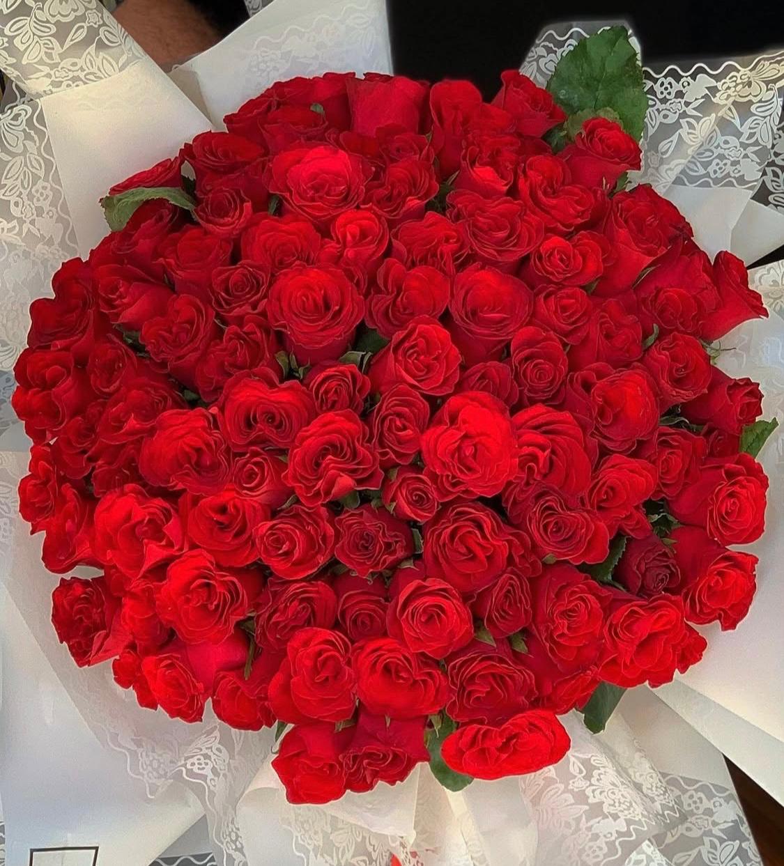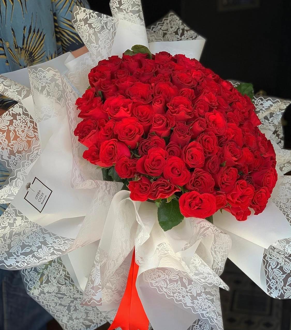 Sevginin en güçlü ifadesi: 101 adet canlı kırmızı gül. Beyaz dantel detaylarla çevrelenmiş bu buket, unutulmaz bir aşk hikâyesinin başlangıcı olabilir.