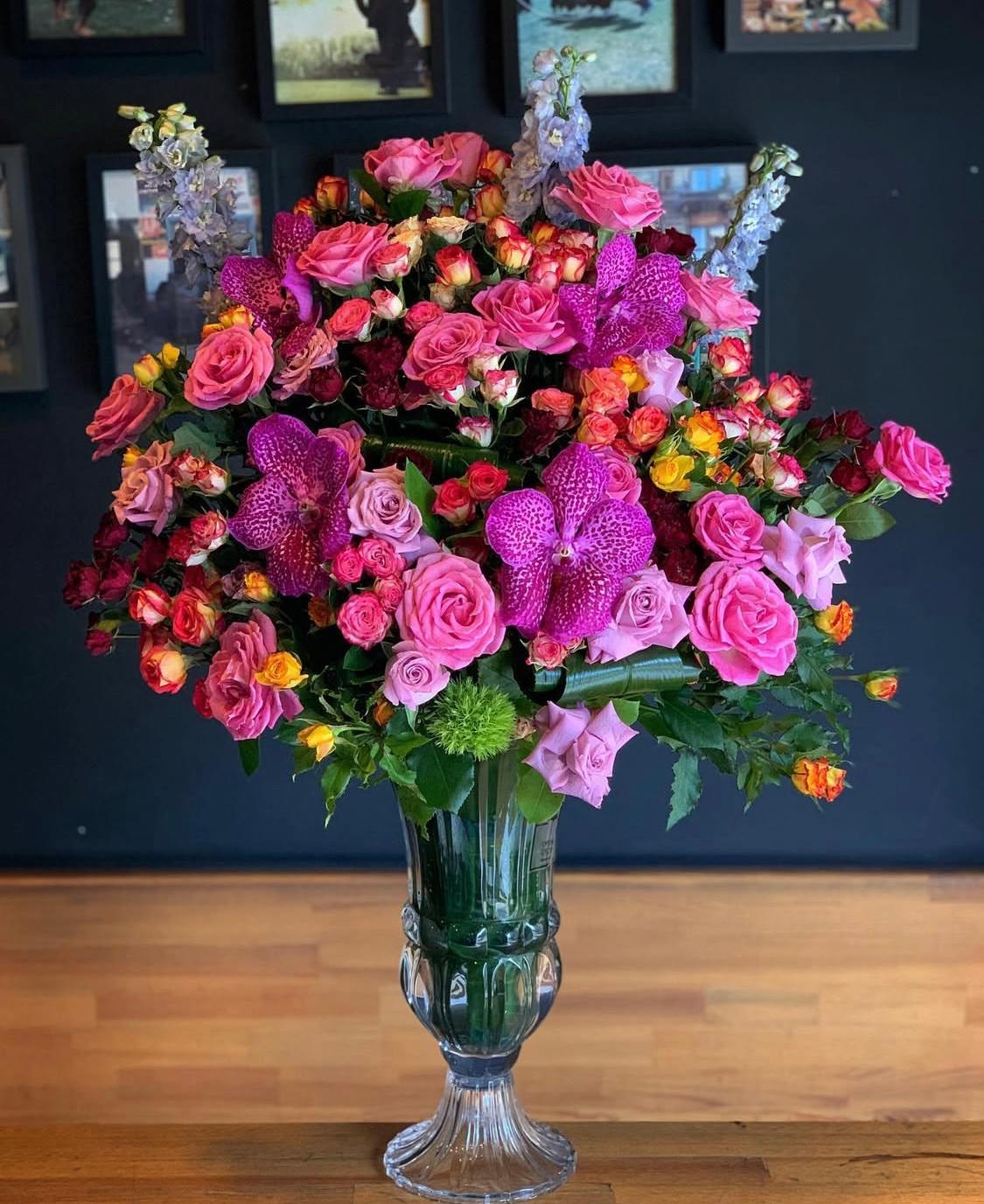 İçerik ve Renkler: Bu devasa Aranjman; Kupa el yapımı üfleme cam vazoda pembe, somon ve beyaz güller, pembe ve mor orkideler, mavi delphinium ve pembe krizantem gibi farklı türdeki çiçeklerin dansıyla bir senfoni oluşturur.