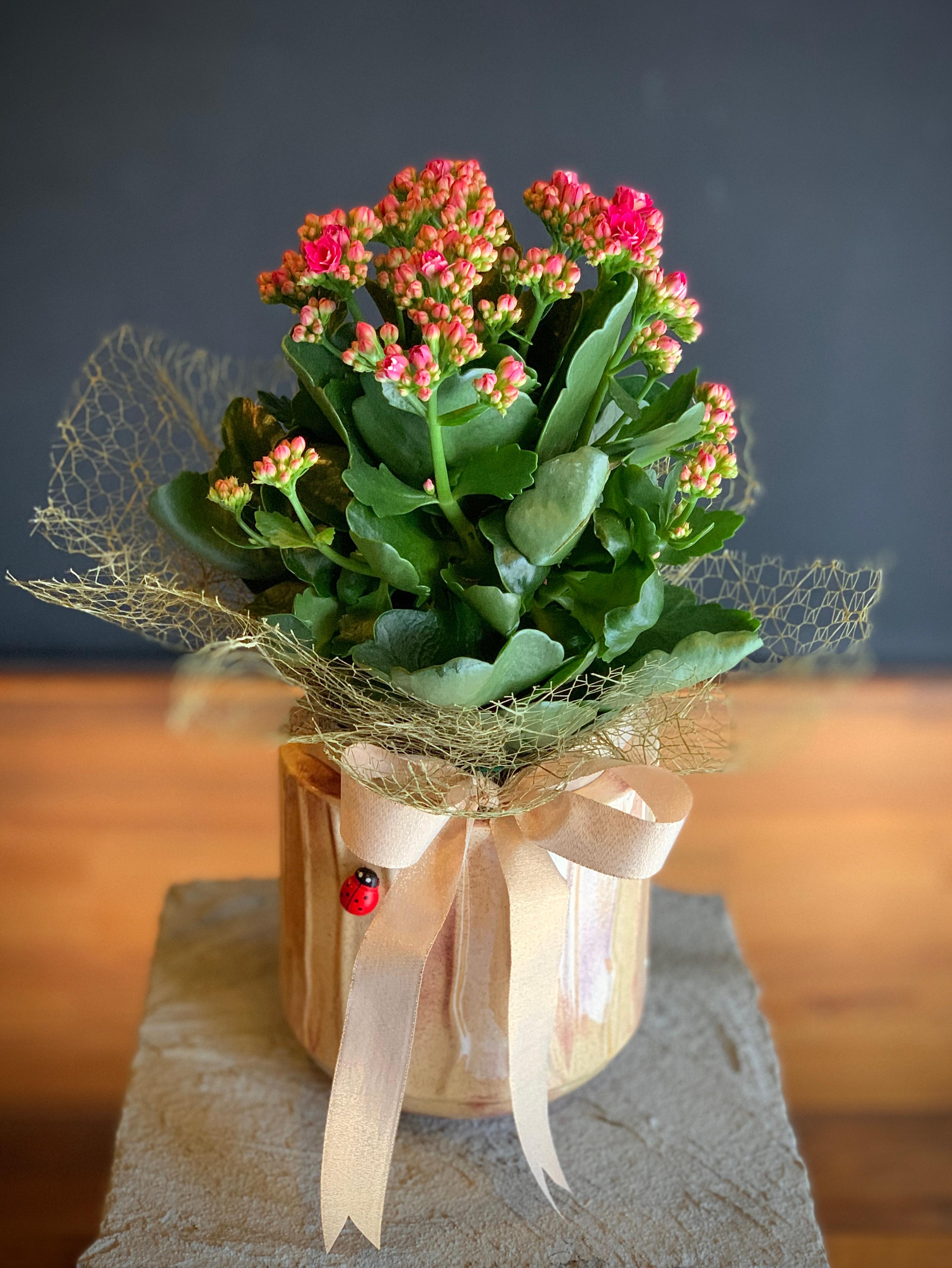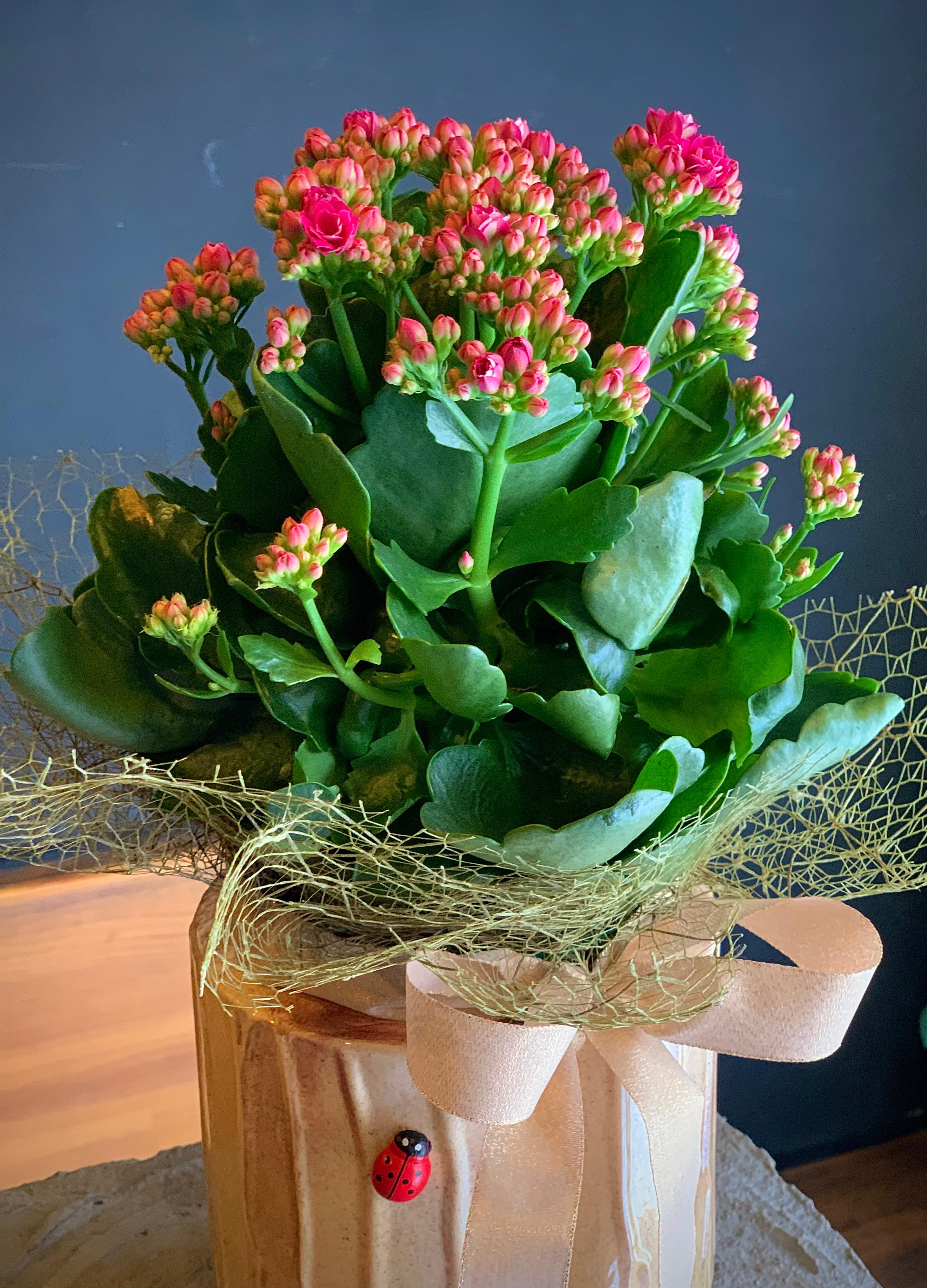Krem ithal seramik içerisinde Pembe çiçekli Kalandiva bitkisi.