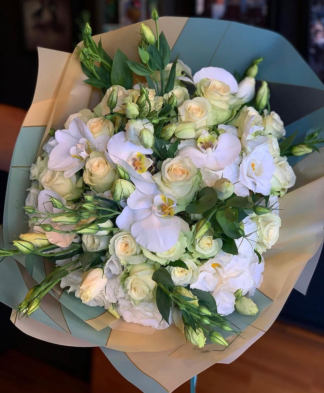Beyaz Gül ve Lisianthus çiçeklerinin dans ettiği bu zarif tasarım, kalpten gelen en tatlı “seni seviyorum” cümlesi gibidir.