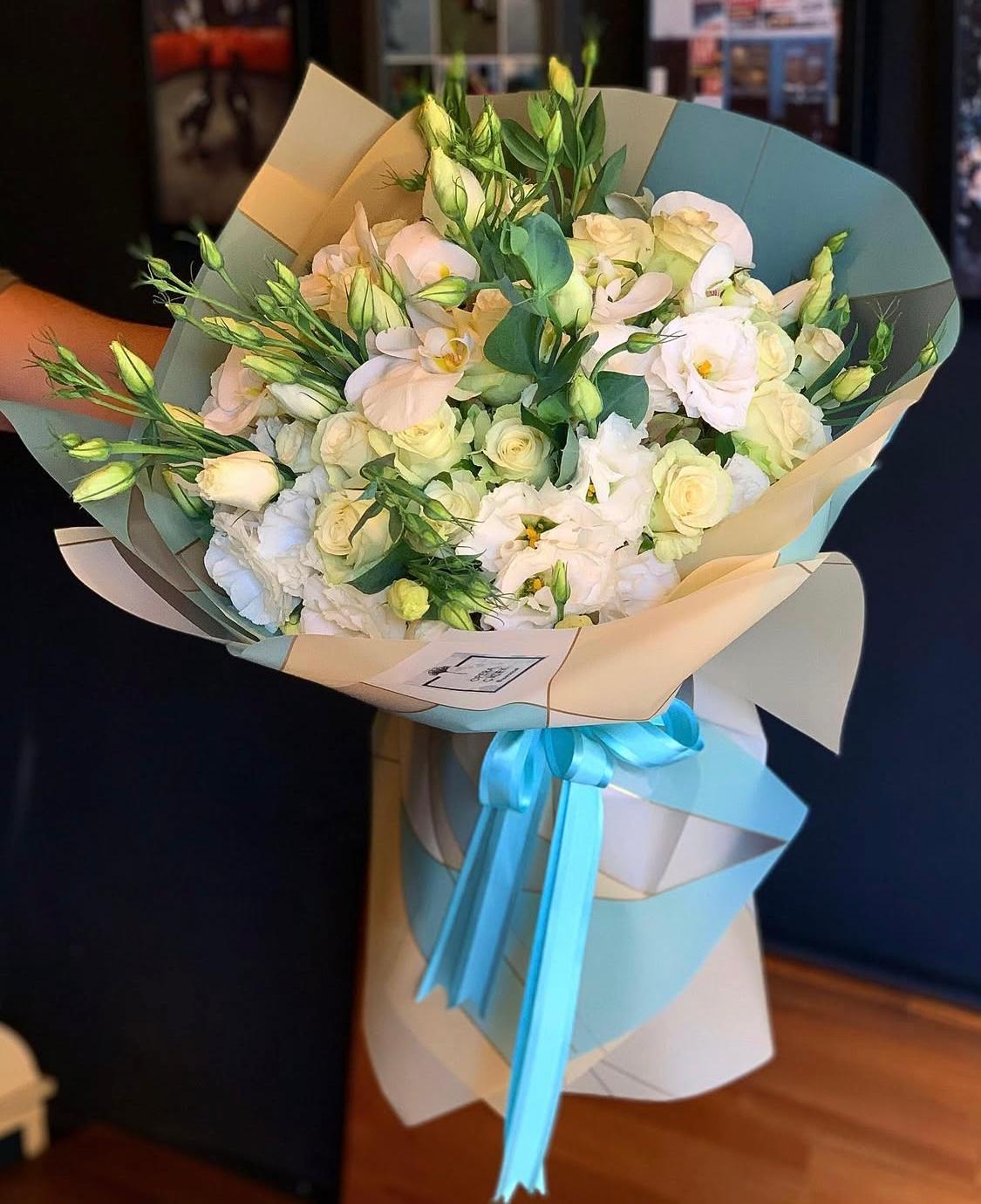 İçerik: Beyaz Lisianthus ve yeşillikler.