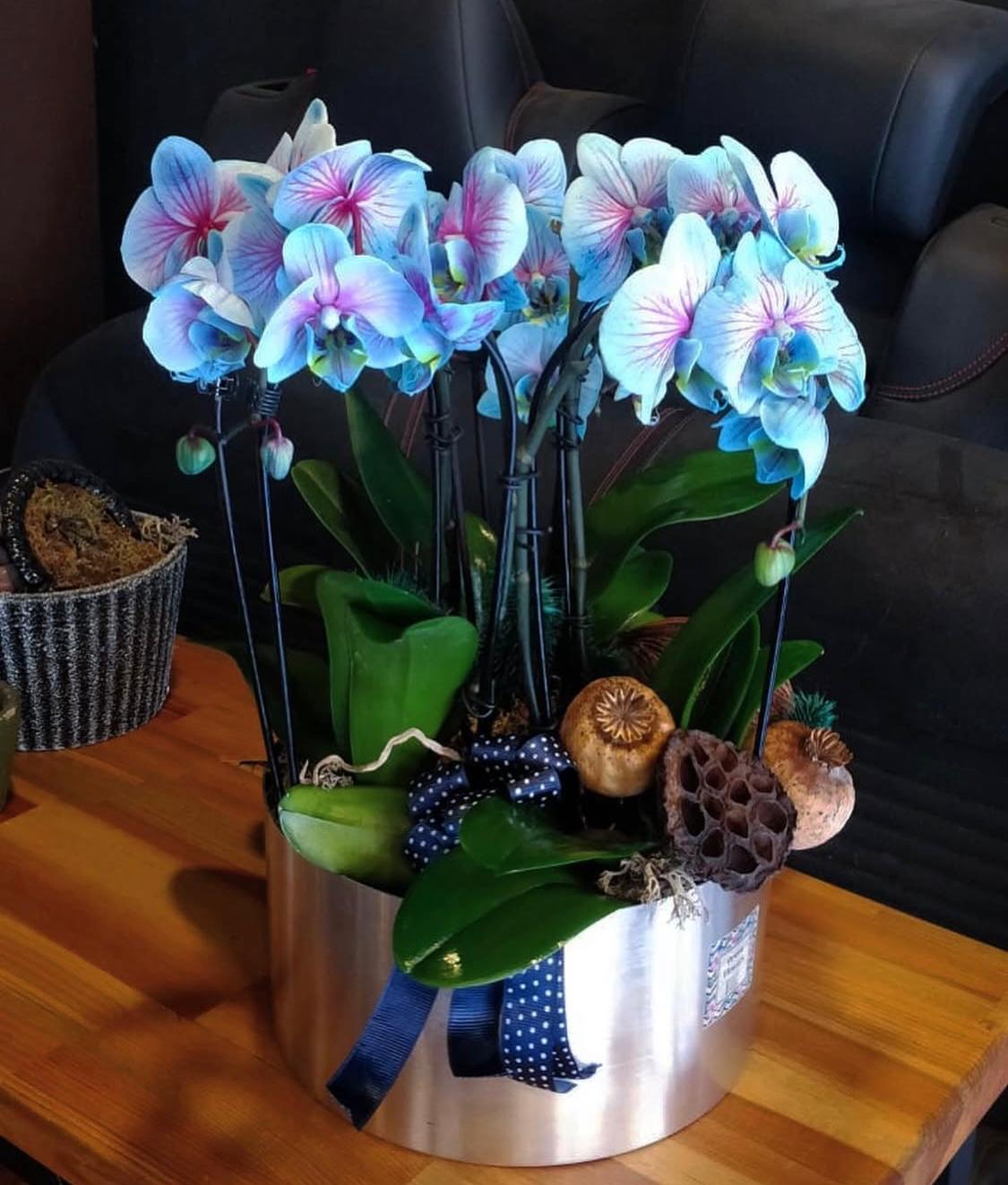 Pastel renklerin romantik dansı.Mavi, pembe ve mor tonlarındaki orkideler ile hazırlanan bu göz alıcı tasarım, renkli bir rüya gibi. Modern ve sofistike sunumuyla bulunduğu ortama taze bir hava katar.
