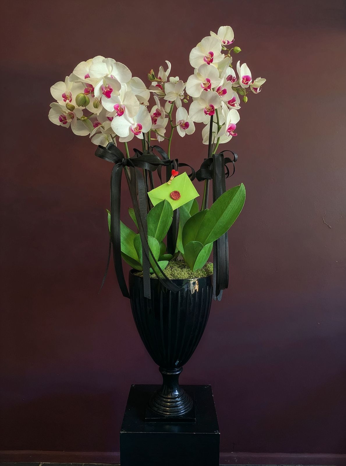 Mavi ve mor tonlarında egzotik orkideler, kuru bitkiler ve palmiye yapraklarıyla dramatik bir şıklık sunar. Özel günler, iş tebriği ya da etkileyici bir hediye için ideal.