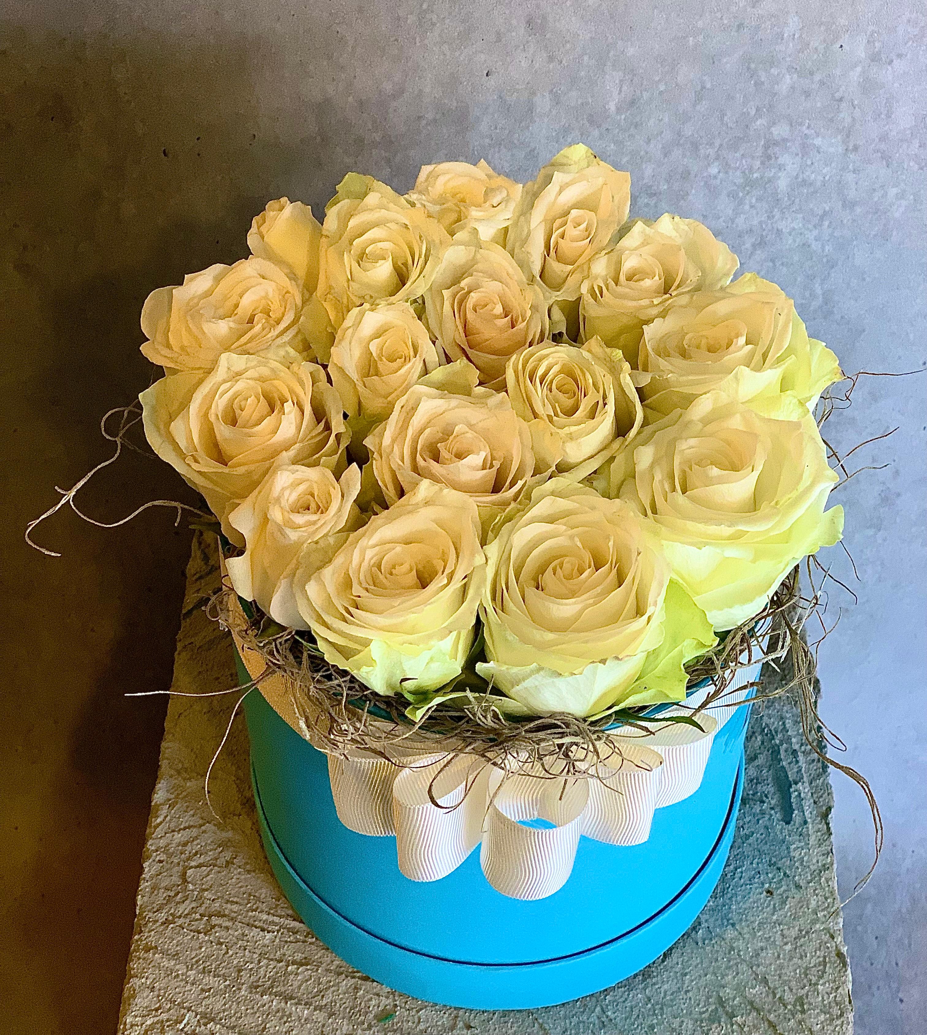- Zarif krem tonlarında güller, turkuaz renkli kutu içerisinde sade ve modern bir tasarımla sunulmuştur. Şık kurdele detayıyla zamansız bir hediye seçeneği. Düğün, teşekkür veya ev dekorasyonu için mükemmeldir.