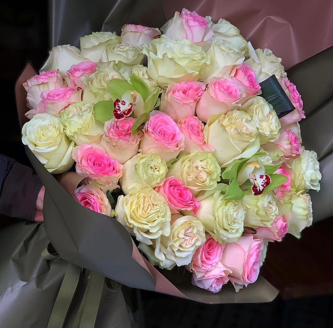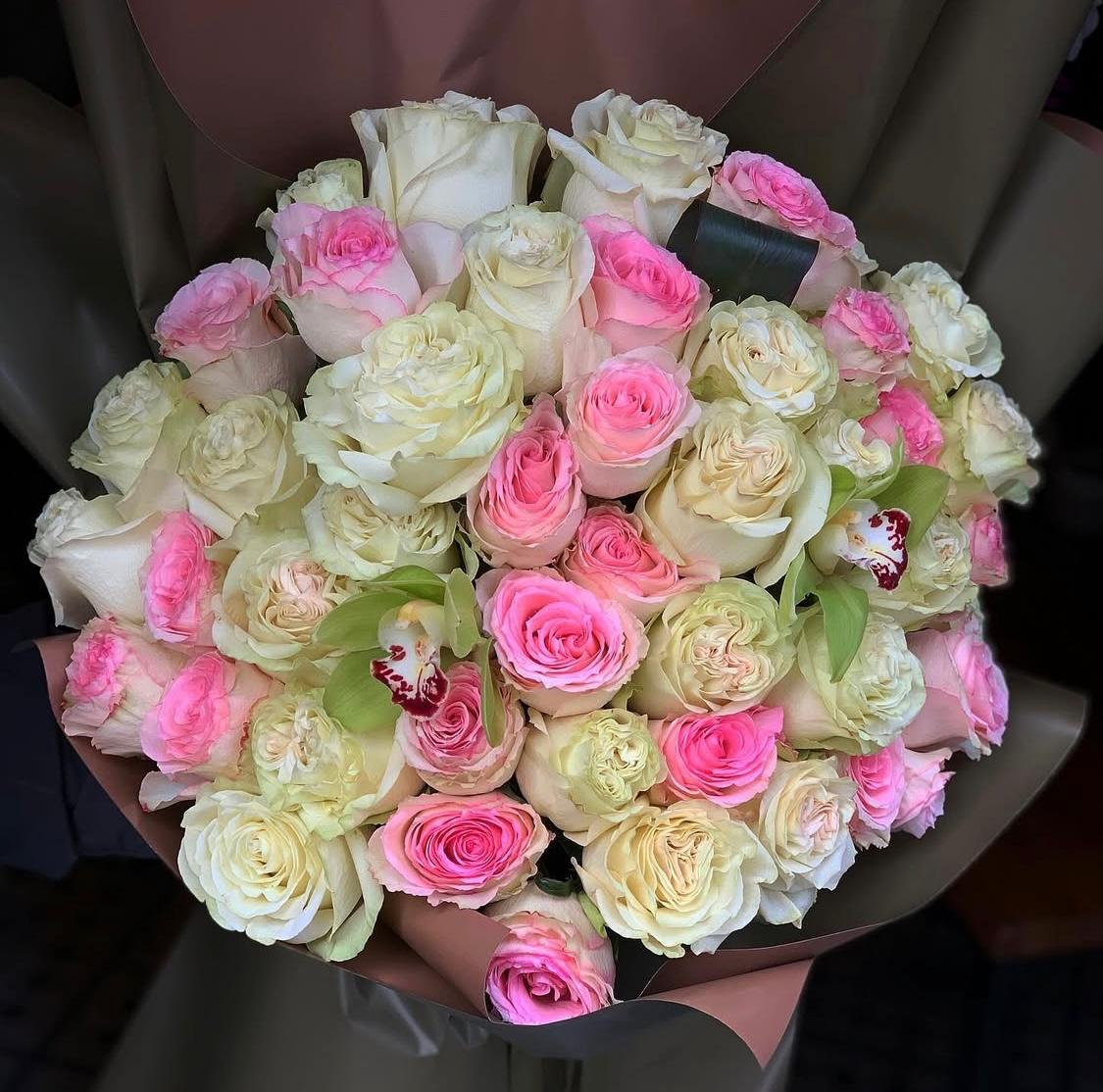 Yumuşak pembe, krem ve beyaz güllerin çiçeklerle dans ettiği bu zarif tasarım, kalpten gelen en tatlı “seni seviyorum” cümlesi gibidir.