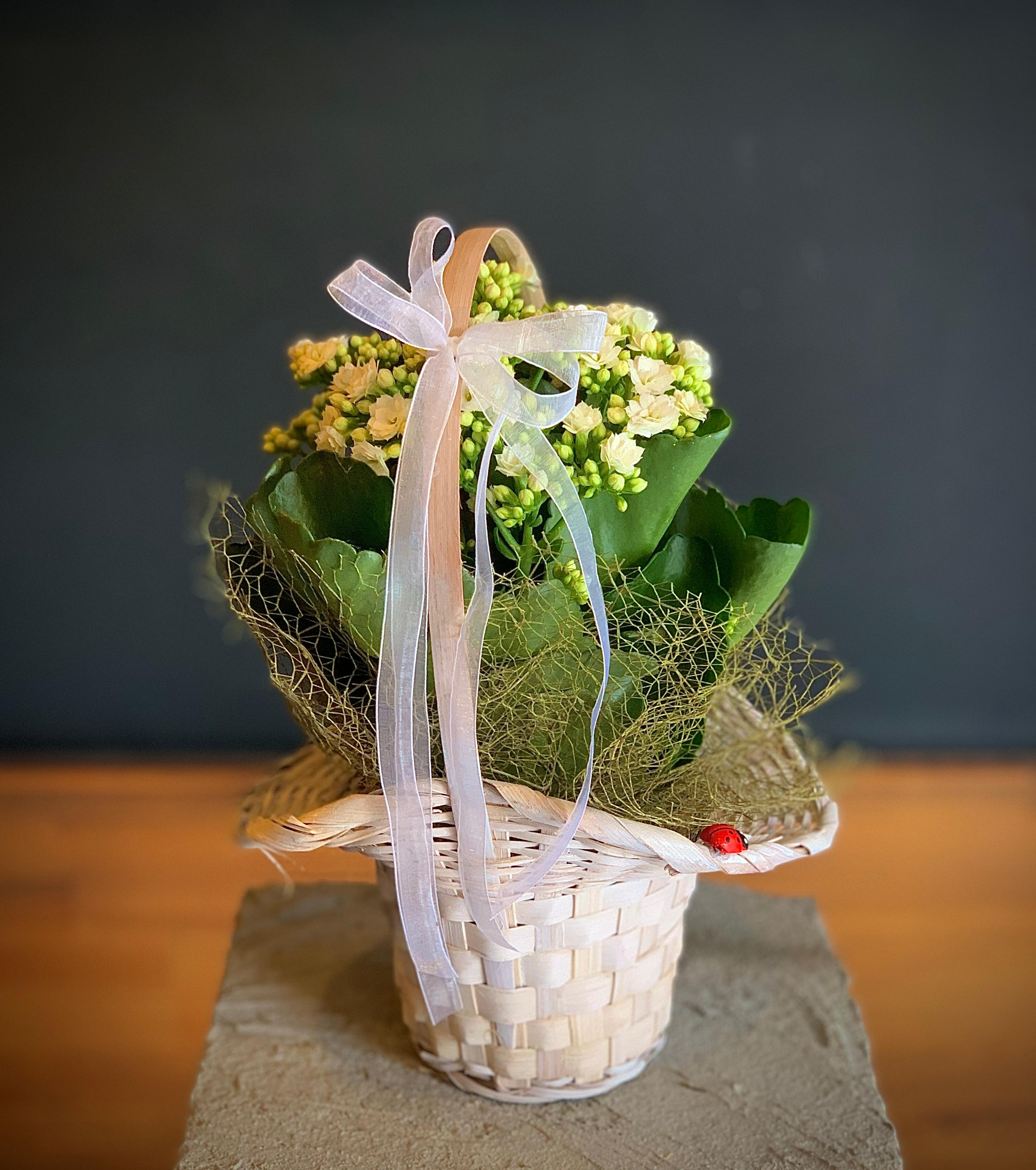 Beyaz  kulplu sepet içerisinde  Beyaz çiçekli Kalandiva  bitkisi.