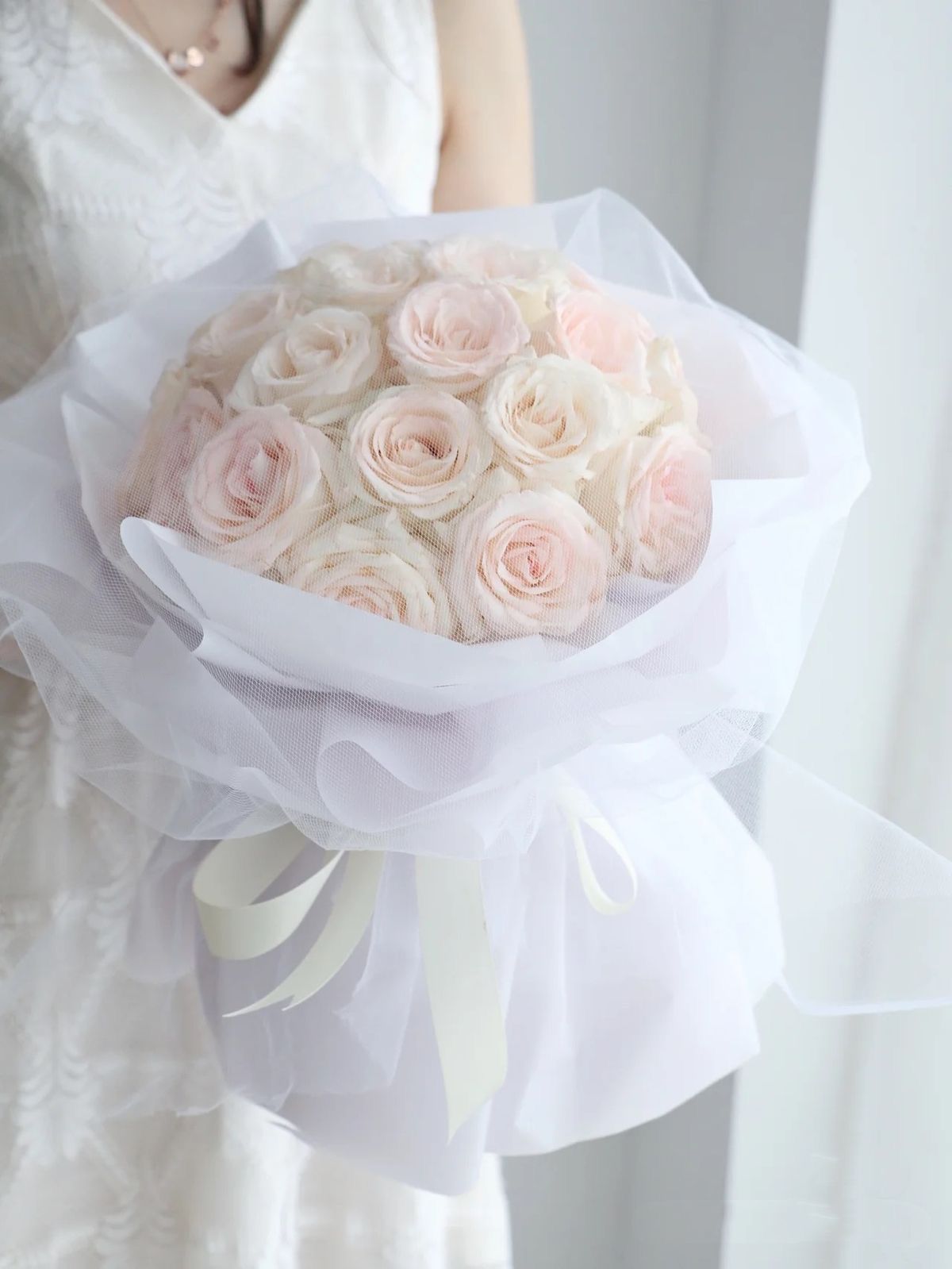 İçerik ve Renk: Yaklaşık 15 adet yumuşak ve narin açık pembe/şampanya rengi gülden oluşur. Tamamen beyaz, yumuşak tül ve saten kurdele ile sarılmıştır. Zariflik ve saflık ön plandadır.