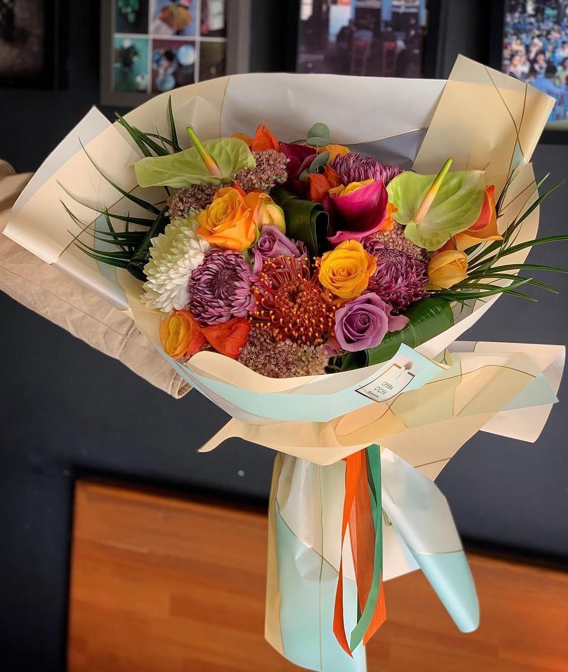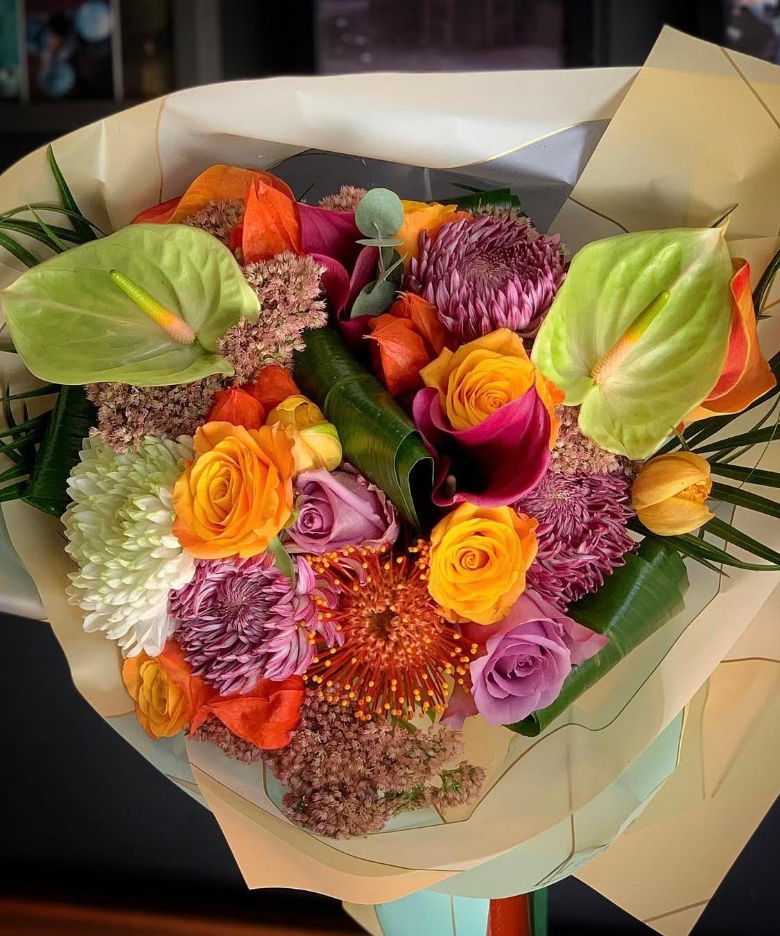 İçerik ve Renkler: Turuncu ve sarı güller, bordo ve mor krizantemler, turuncu anteryumlar ve tropikal yeşilliklerle hazırlanan bu buket, sonbaharın sıcak renklerini yansıtır.