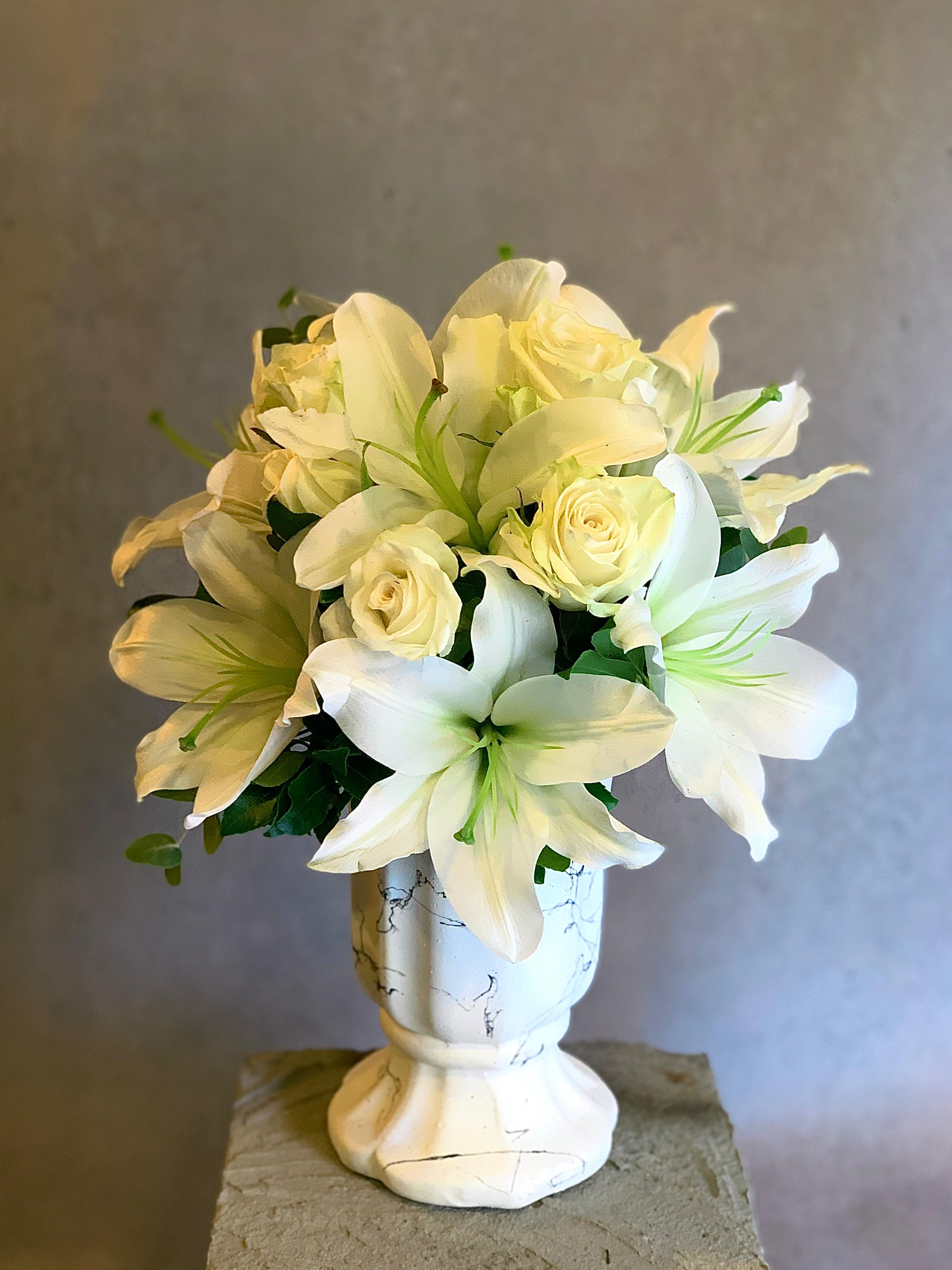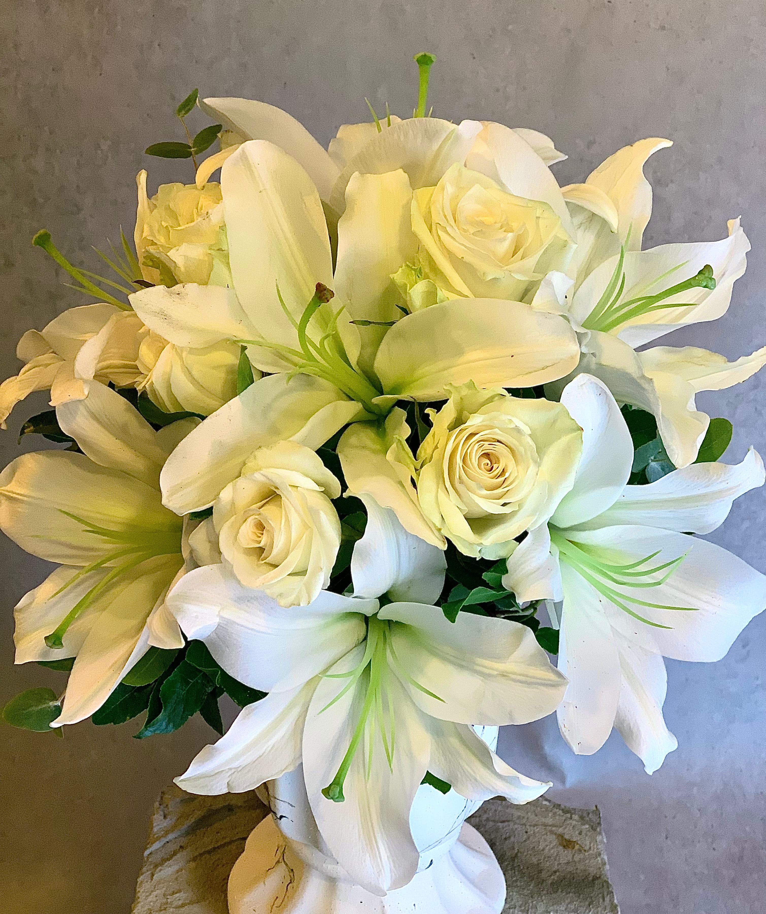 Composé de 5 branches de lys blancs frais, idéal pour les occasions spéciales telles que les anniversaires et les anniversaires.