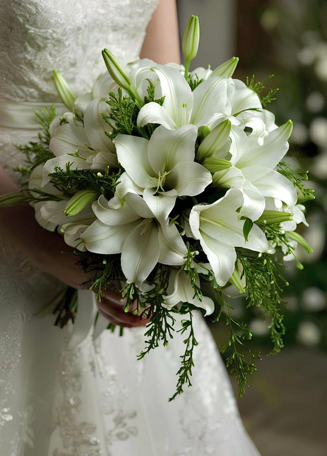 Geleneksel zarafetin ve temiz başlangıçların simgesi olan bembeyaz zambaklar ile hazırlanmıştır. Etrafını saran yoğun, canlı yeşillikler buketin ihtişamını ve tazeliğini artırır. Klasik, büyük ve gösterişli bir buket hayal eden gelinler için asil ve kalıcı bir seçimdir."