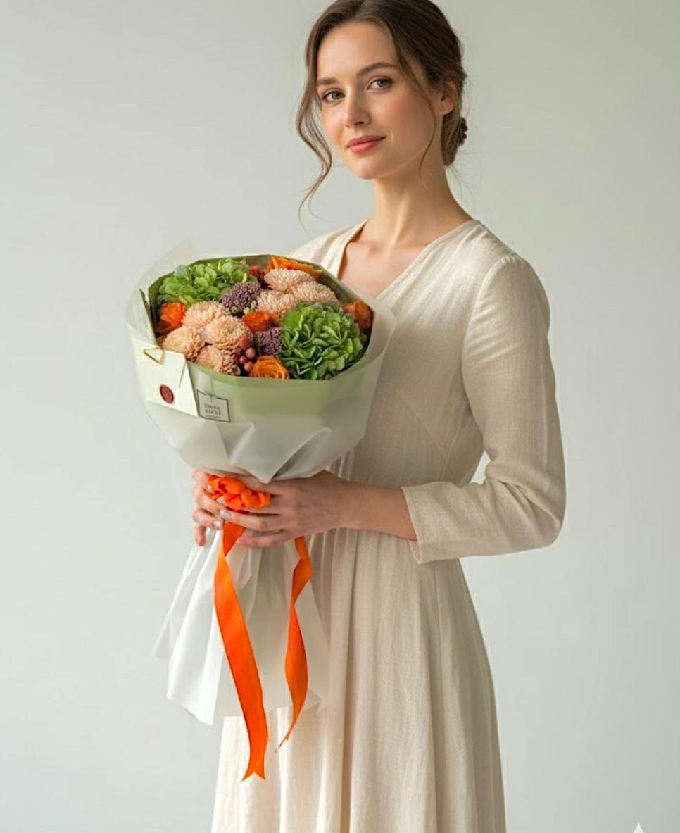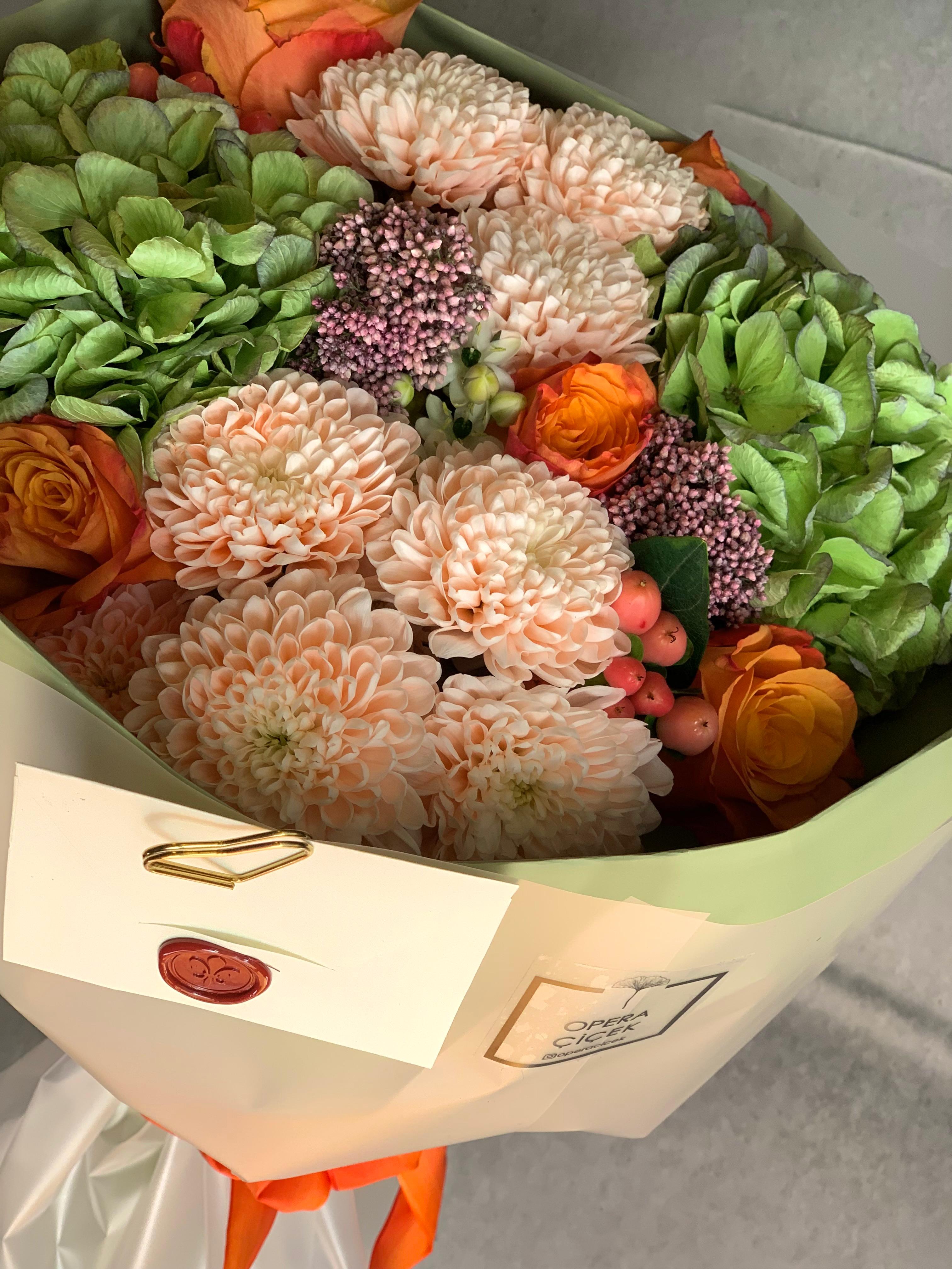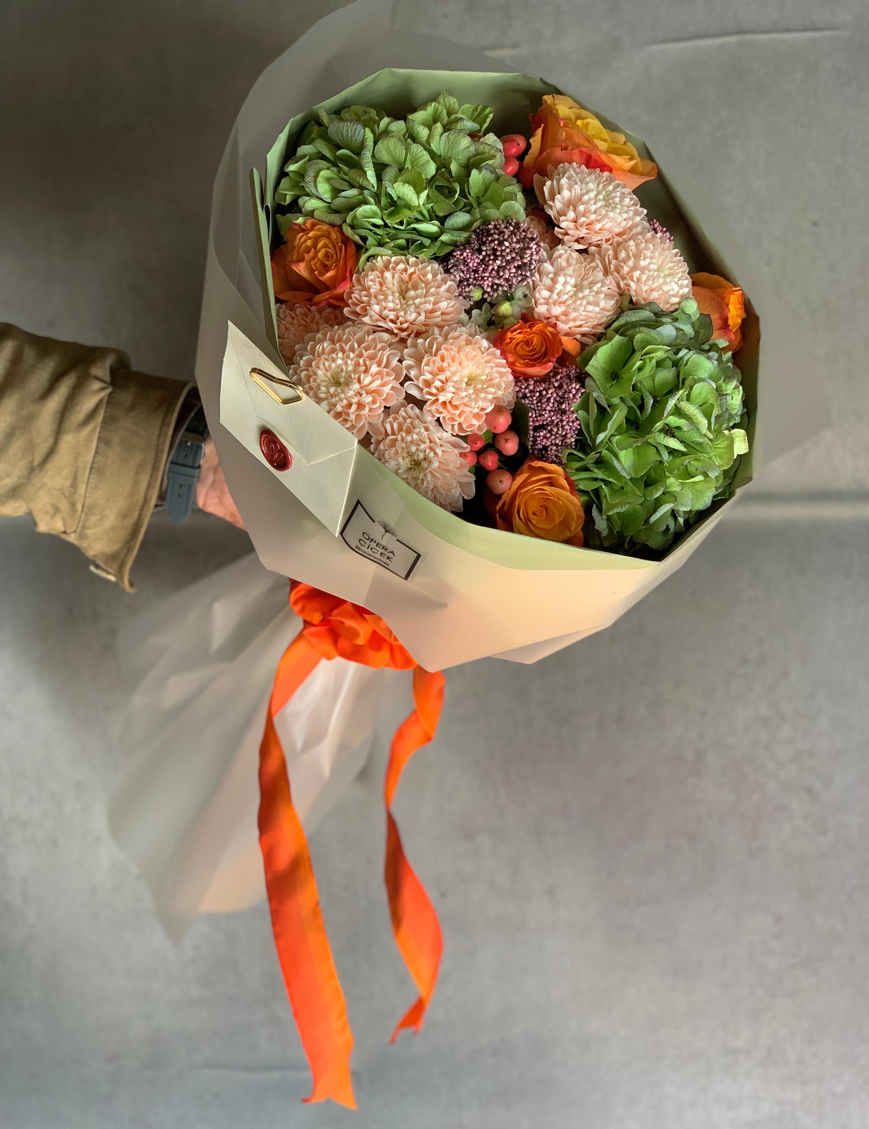 İçerik: Yeşil ortancalar, şeftali tonlarında krizantemler, turuncu güller, pembe meyve detayları ve dolgu çiçekleri.