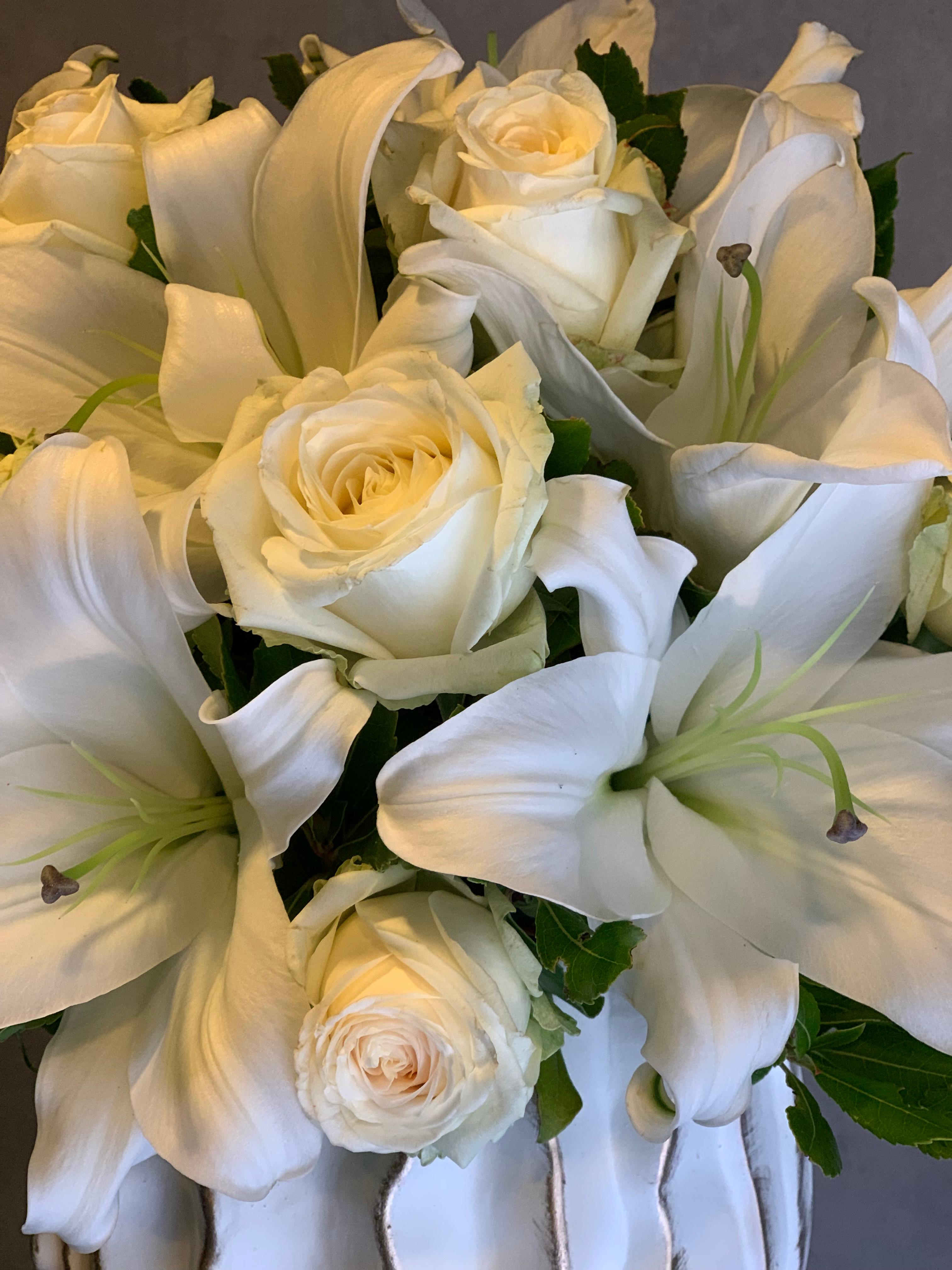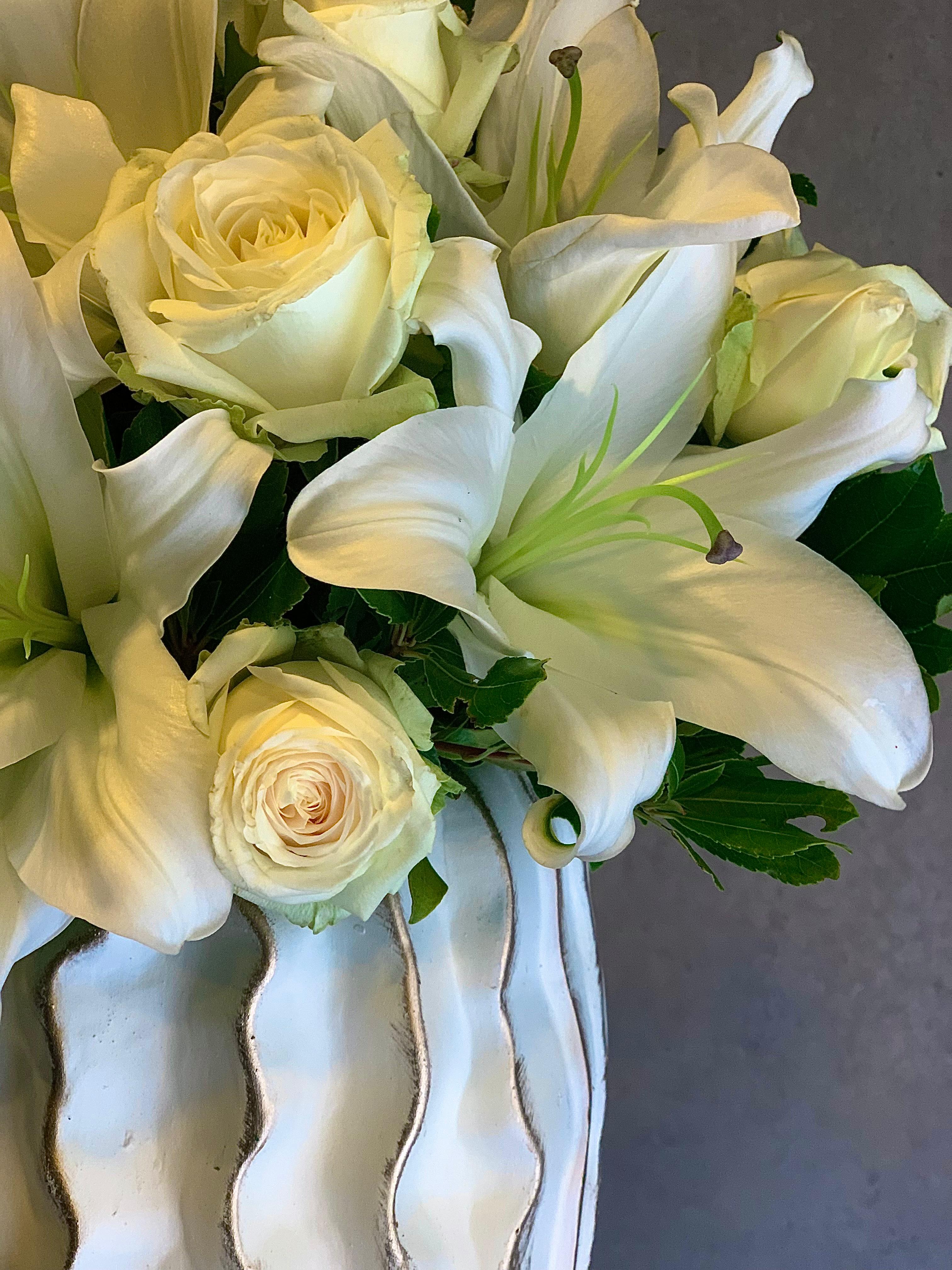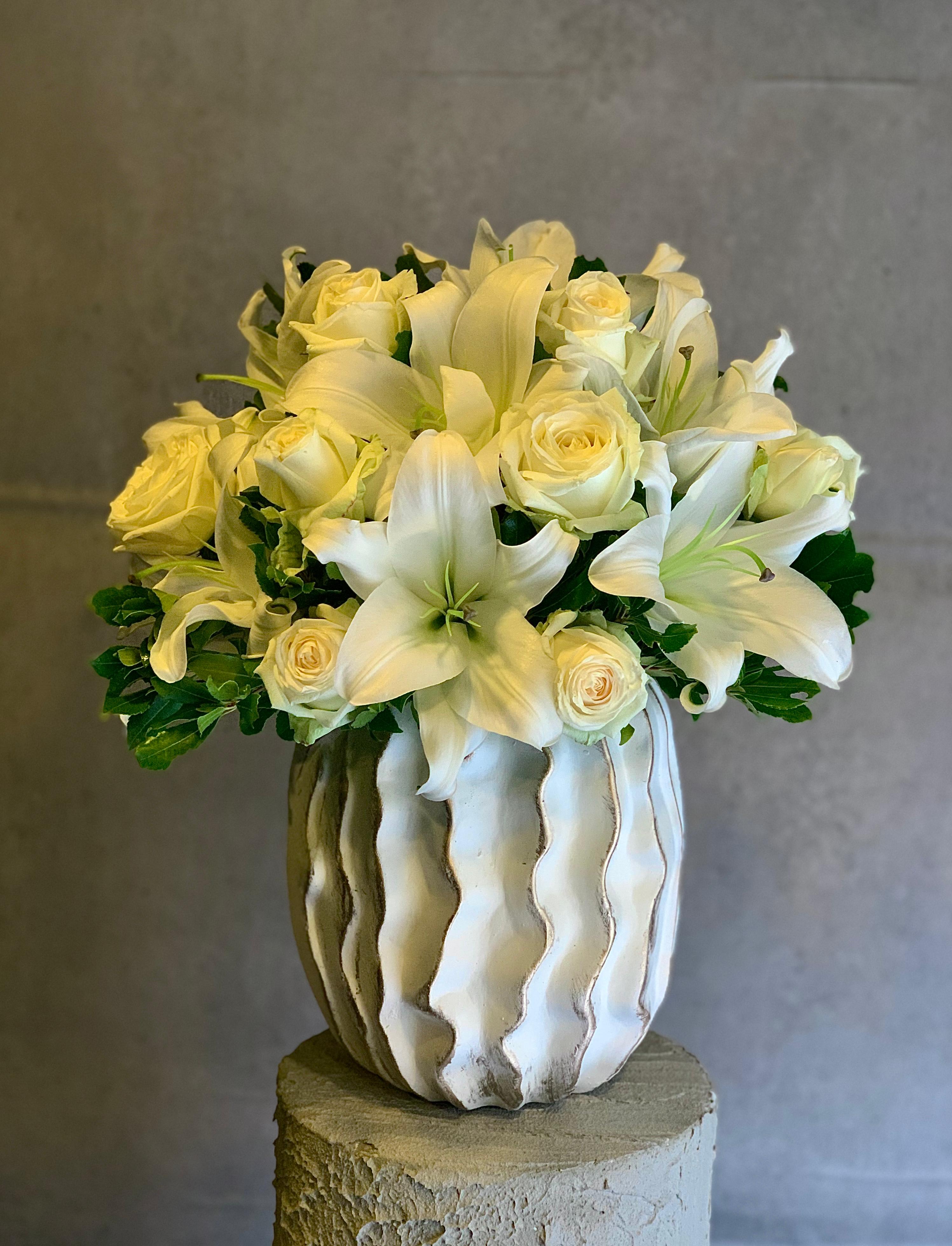 Büyük boy Beyaz Lilyum ve Beyaz Gül Aranjmanı