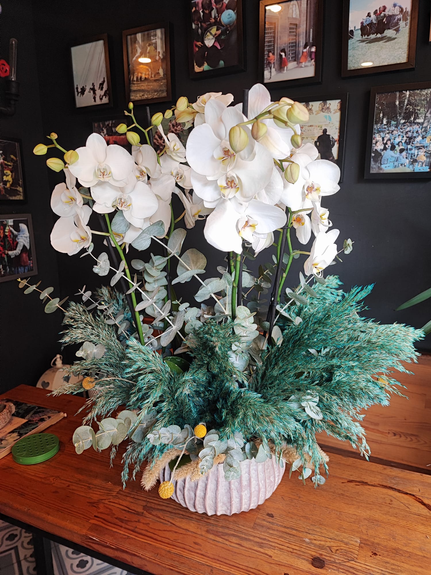 Adeta bir sanat eseri! Büyük boy beyaz orkide, gür ve göz alıcı turkuaz/mavi-yeşil renkte işlenmiş kurutulmuş otlar ve okaliptus yaprakları ile çevrelenmiştir. Bu aranjman, çiçekçilikteki son trendleri yansıtarak mekânınıza sofistike ve çarpıcı bir görünüm katıyor. Dikkat çekici, kalıcı ve unutulmaz bir hediye arayanlar için en üst düzeyde lüks bir seçimdir.