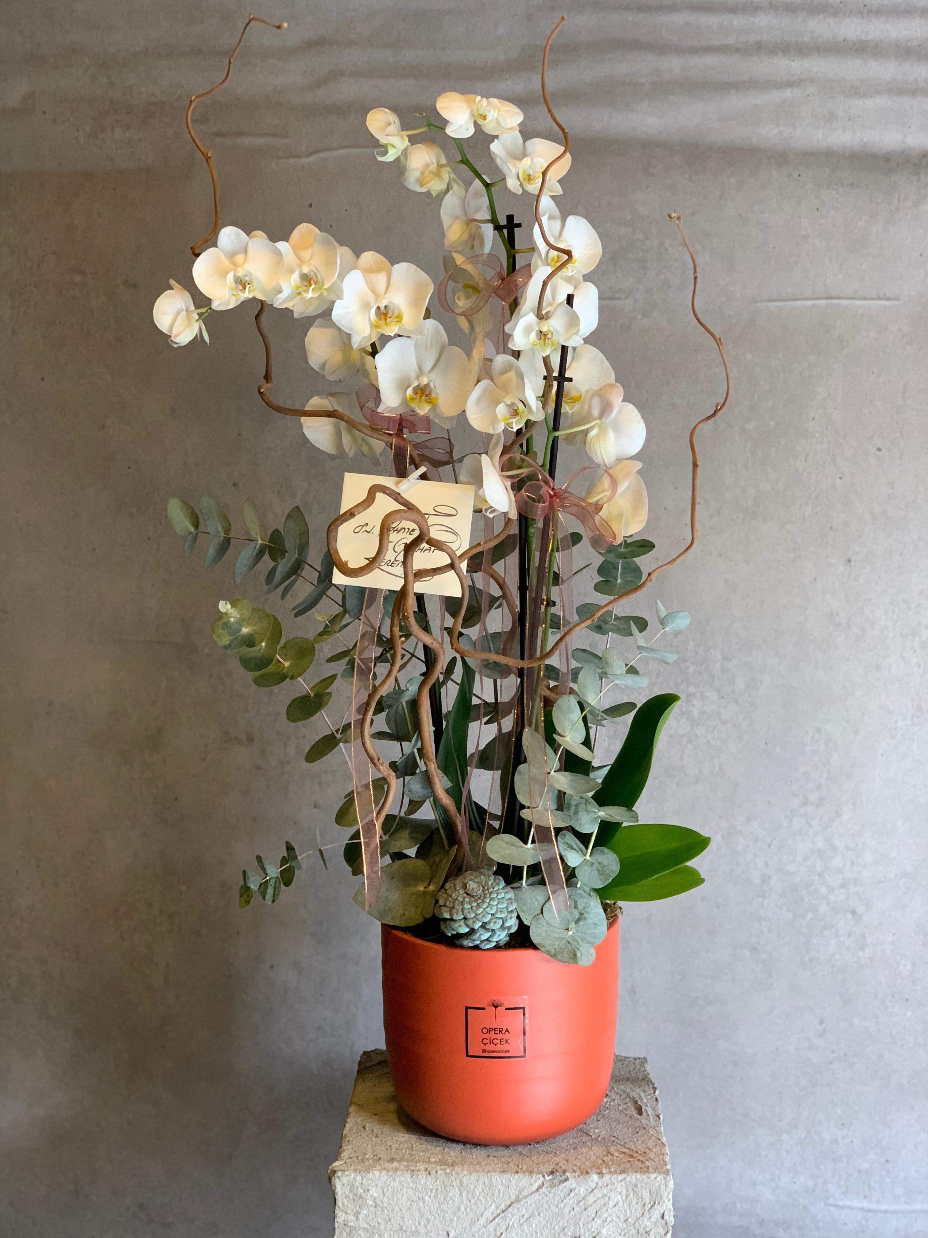 Modern çizgilerin ve doğal elementlerin mükemmel uyumu. Canlı mercan (turuncu) renkli saksı, saf beyaz orkide çiçekleriyle çarpıcı bir kontrast oluşturuyor. Taze okaliptus dalları ve kıvrımlı doğal kuru çubuklar ile zenginleştirilen bu tasarım, ferahlatıcı kokusu ve modern estetiği birleştiriyor. Özellikle genç ve dinamik ofisler veya modern ev dekorasyonları için özgün ve şık bir alternatiftir.