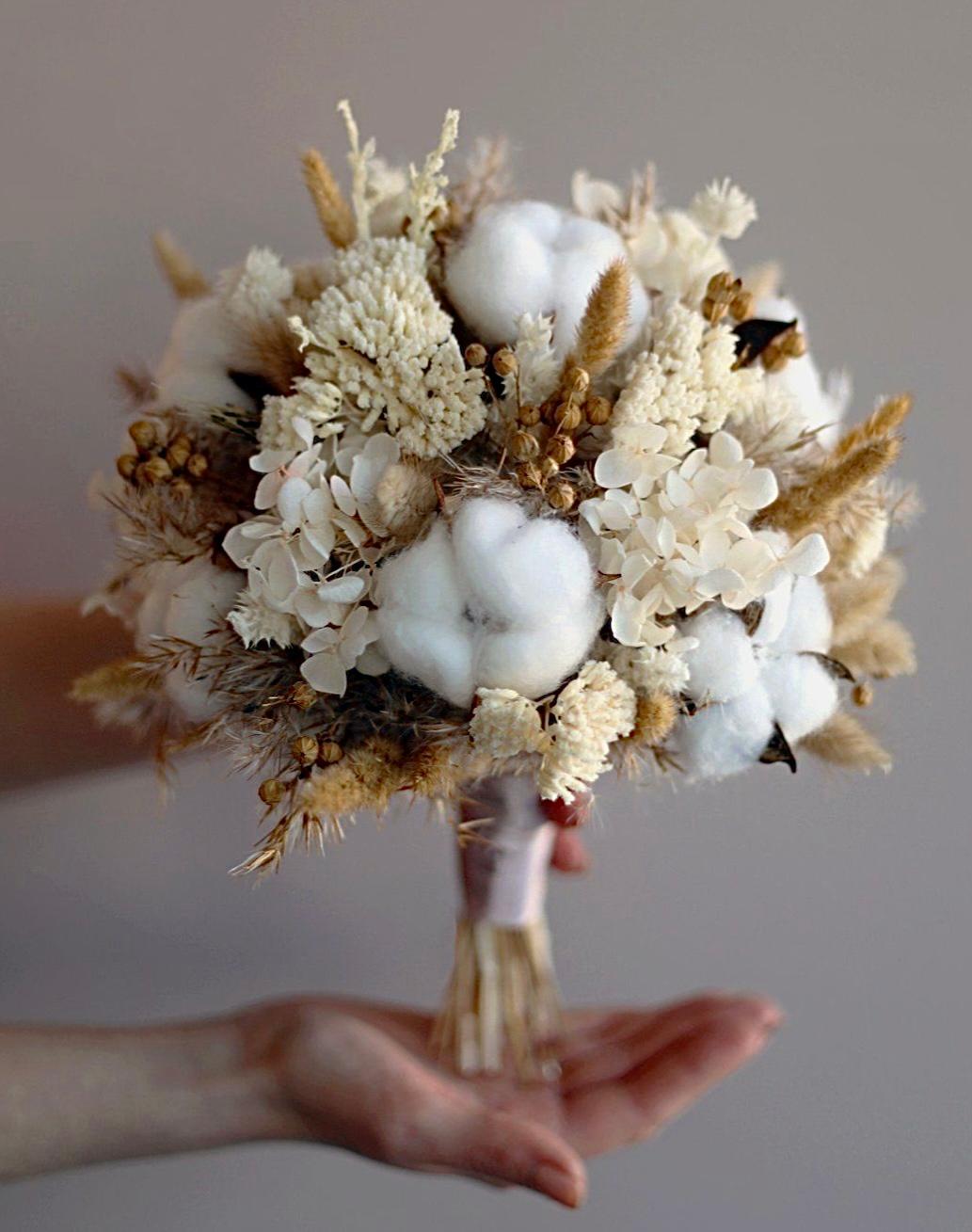 Alışılmışın dışına çıkmak isteyen, doğal ve rustik düğün konseptlerine bayılan gelinler için eşsiz bir seçim! Pamuk kozalarının yumuşaklığı, kuru otlar ve doğal tonlardaki çiçeklerle harmanlanarak kalıcı ve dokulu bir buket oluşturuldu. Düğün gününüzden sonra bile evinizin en güzel köşesini süslemeye devam edecek.