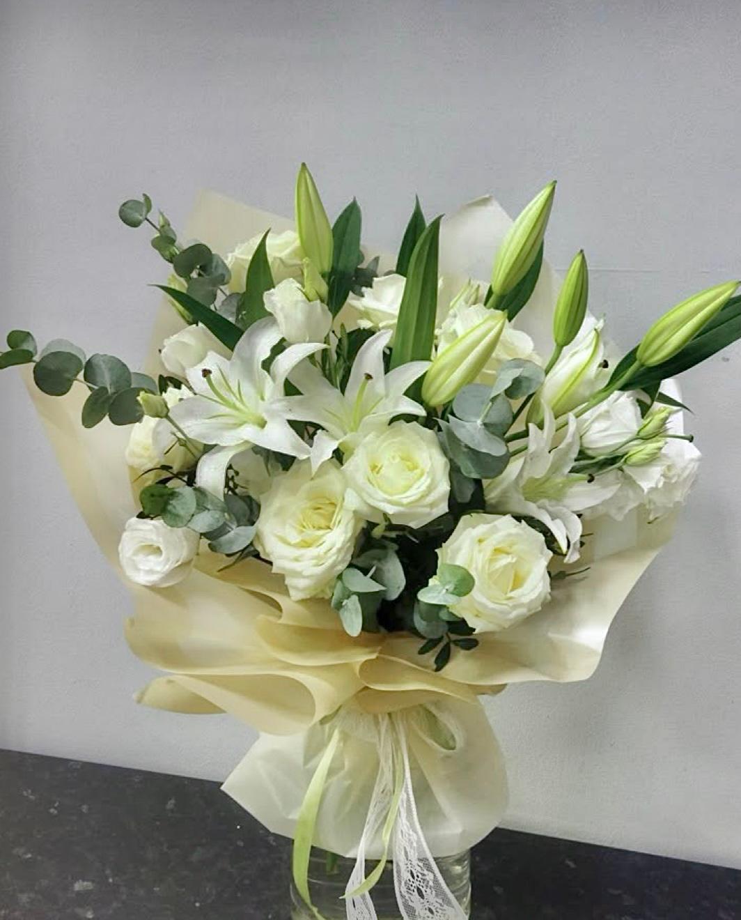 İçerik: Beyaz tonlarda, zarif lilyum ve güller.