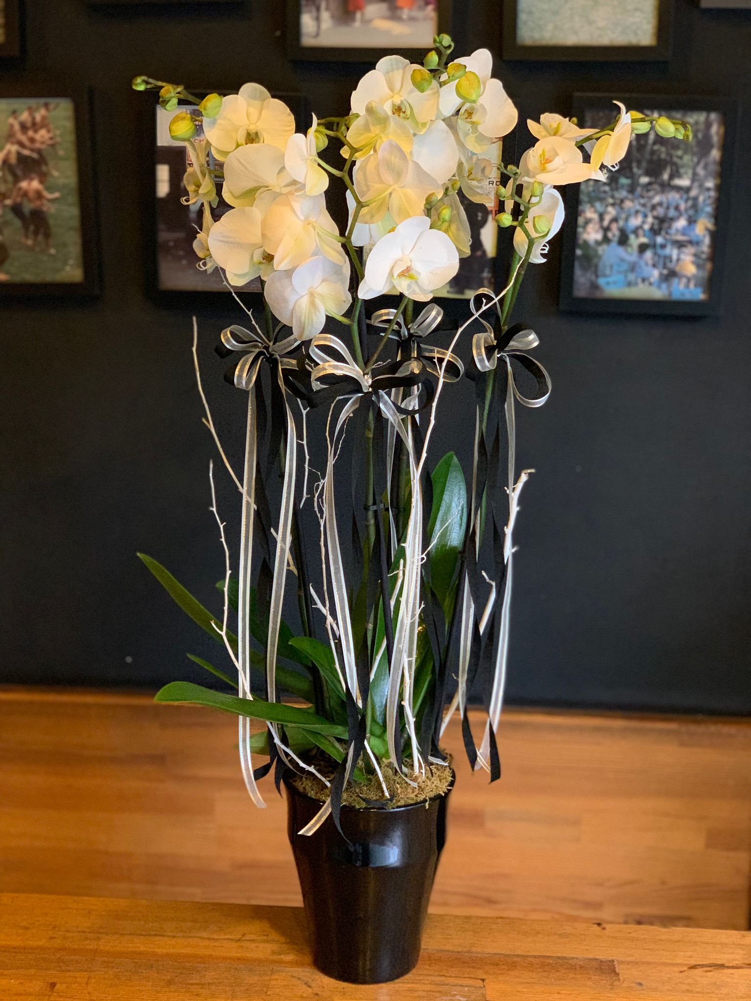 Siyah saksı içinde yükselen bembeyaz orkideler, siyah ve şeffaf kurdelelerin oluşturduğu uzun, akıcı süslemelerle asil bir duruş sergiliyor. Ciddi ve şık mekanlara değer katmak, üst düzey tebrikleri iletmek veya iyi dileklerinizi zarifçe sunmak için idealdir.