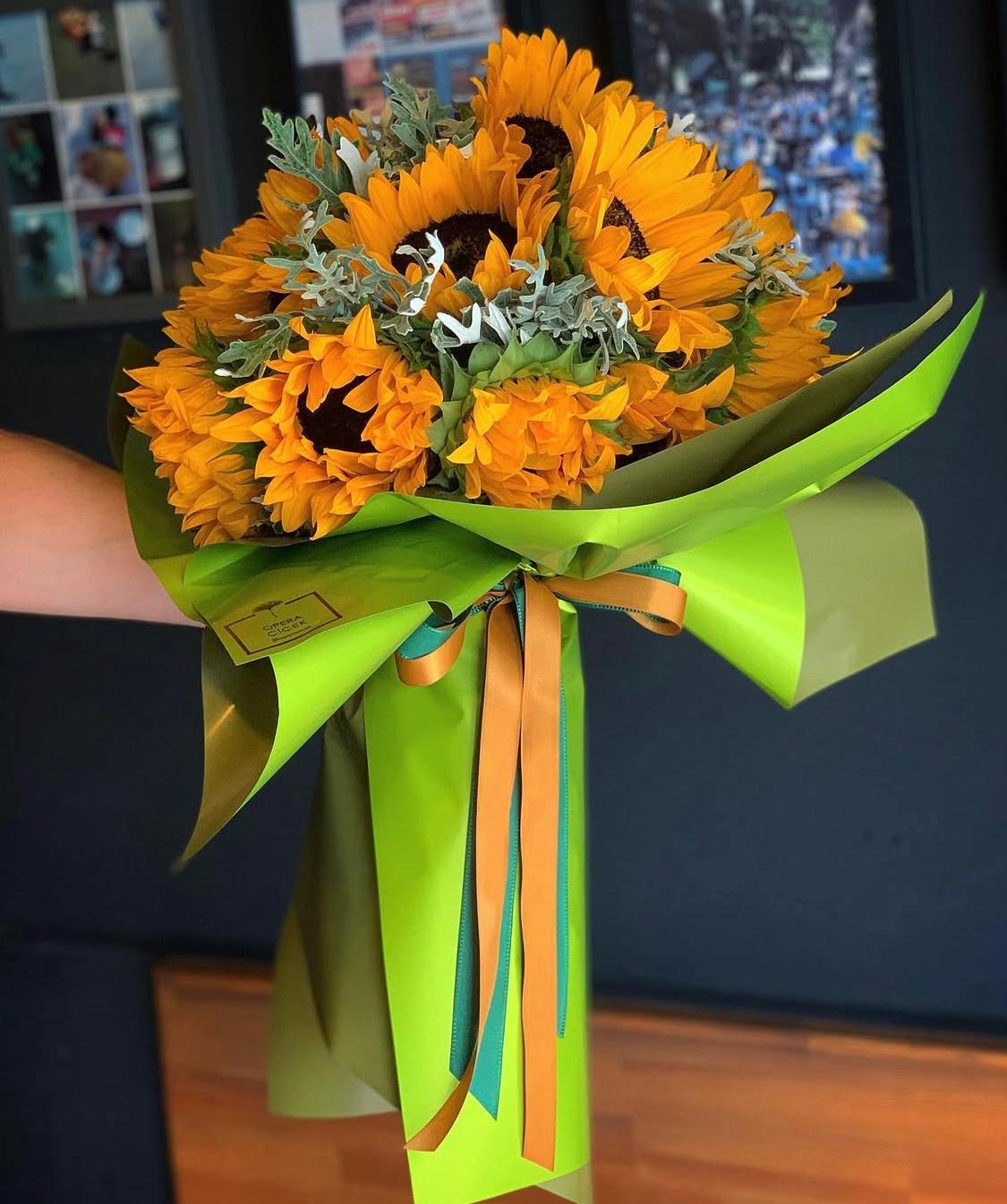 Ambalaj: Yeşil ve turuncu renkli kağıt ambalajı, ayçiçeklerinin enerjisini tamamlar.