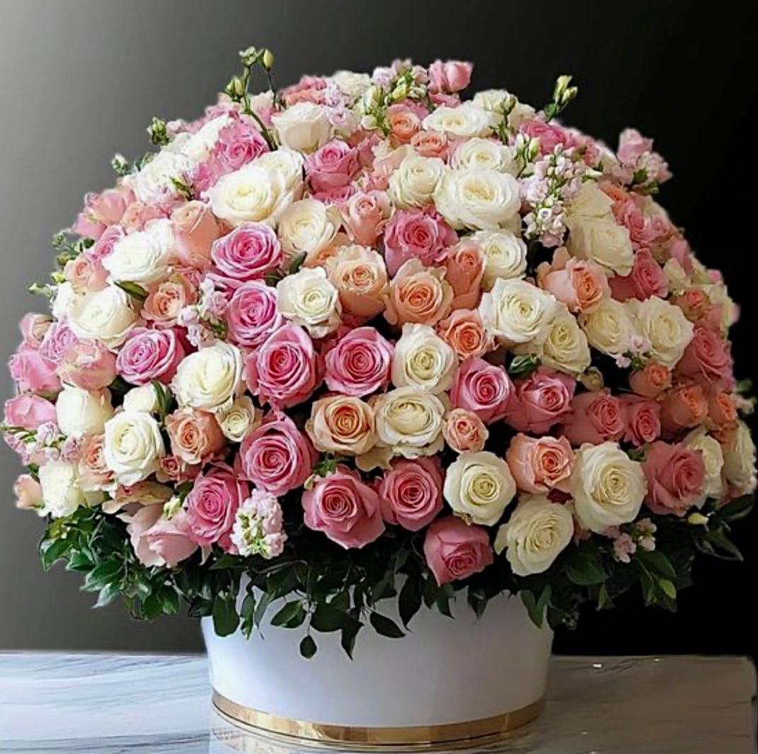 Aşkın Büyülü Bahçesi. Yumuşacık pembe, saf beyaz ve şeftali tonlarındaki güllerin ahengiyle oluşturulmuş bu devasa ve gösterişli kubbe, her baktığınızda huzur ve neşe vaat ediyor. En unutulmaz anlar için...
