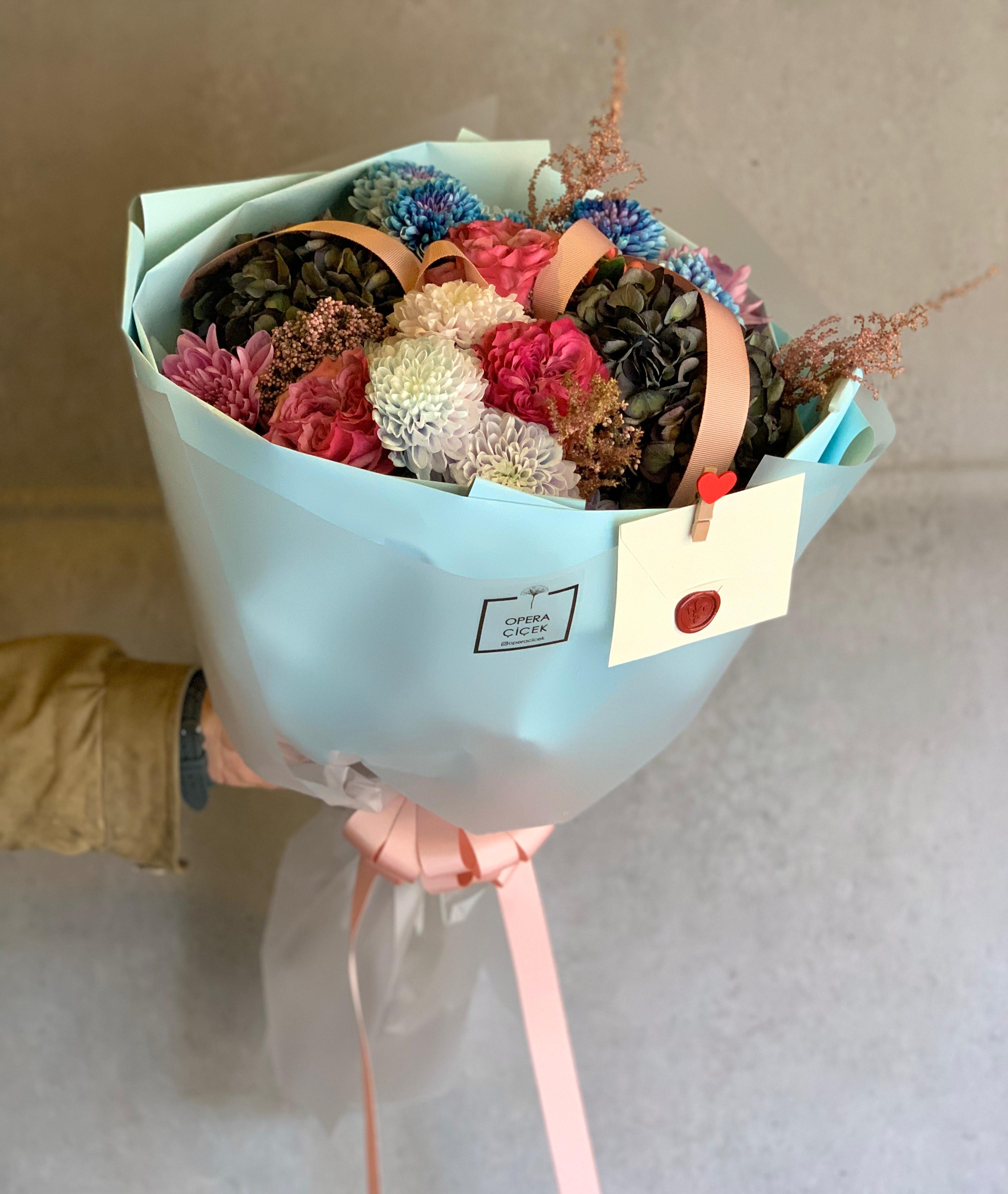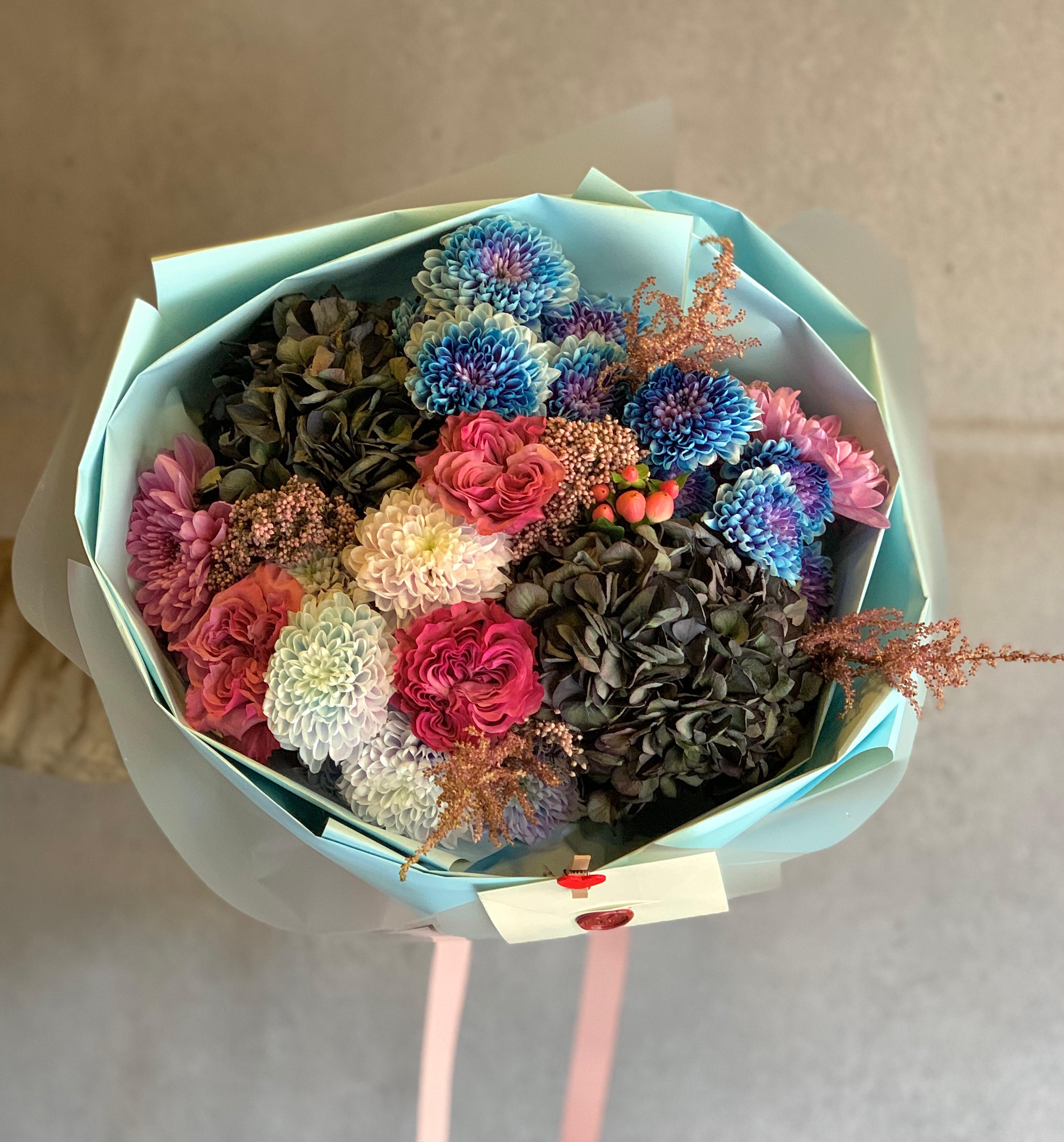 İçerik: Mavi, mor ve pembe tonlarında ortancalar, krizantemler, güller, astilbeler ve hiperikum detayları.