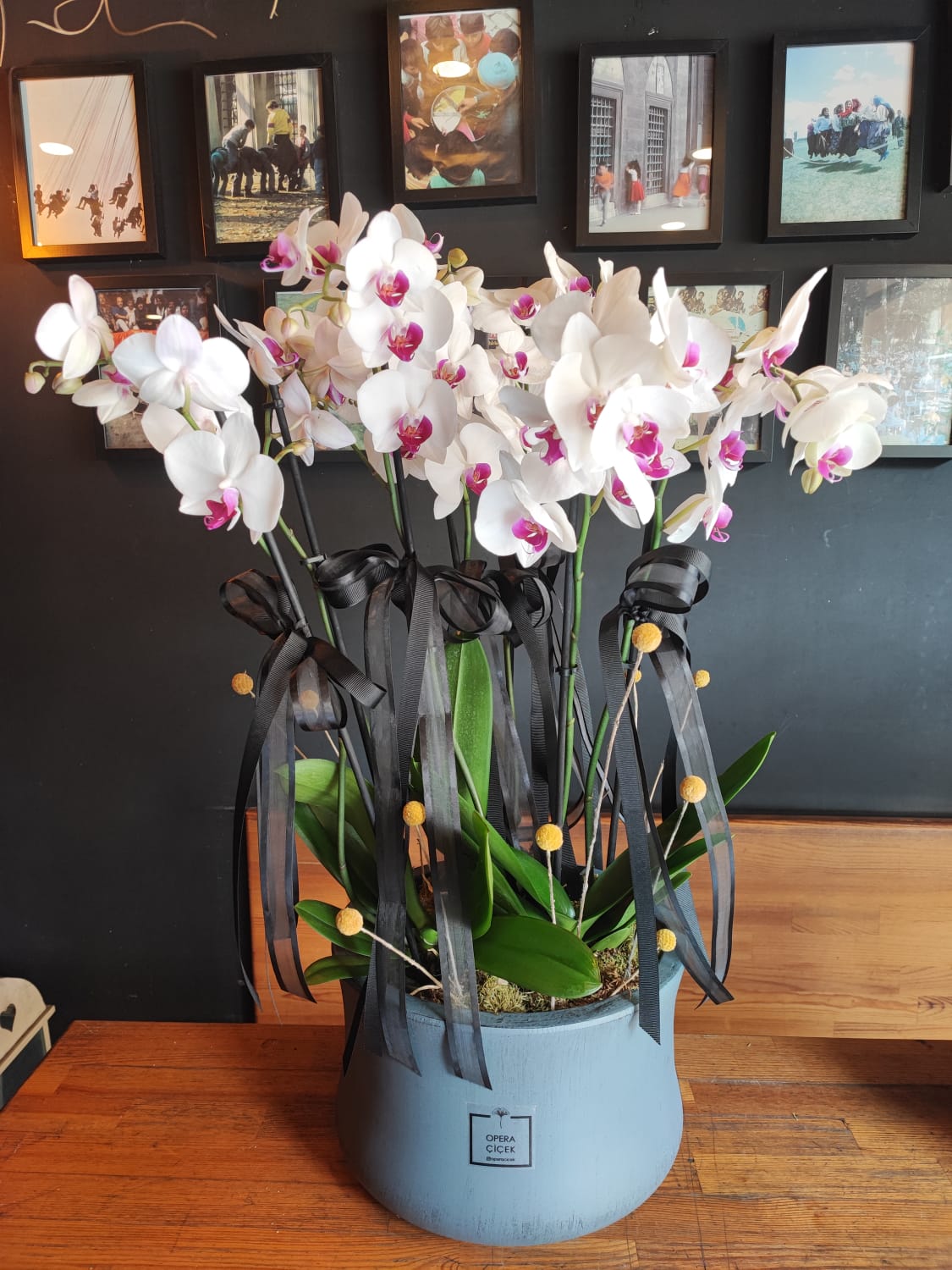 Beyazın saflığı ve siyahın asaleti bu tasarımda buluşuyor. Canlı beyaz çiçeklerin merkezindeki sarı detaylar ile hareketlenen orkideler, bol ve katmanlı siyah saten kurdeleler ile bağlanarak güçlü bir kontrast oluşturuyor. Bu sofistike aranjman, kurumsal hediyeler, açılışlar veya resmi tebrikler için mükemmel bir seçimdir. Modern gri saksı, bu dramatik görünümü tamamlıyor.