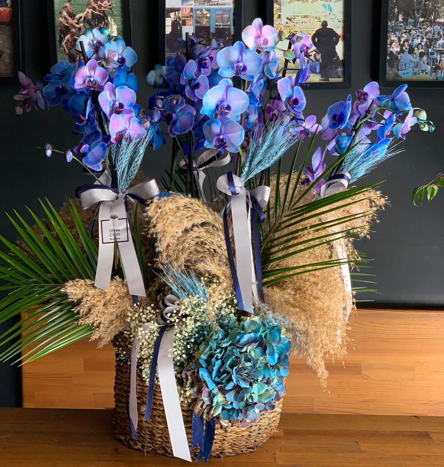 Mavi orkide ve ortancaların büyüleyici tonlarıyla hazırlanmış bu özel aranjman, zarafet ve asaleti bir araya getiriyor. Doğal pampas otları, palmiye yaprakları ve zarif kurdele detaylarıyla tamamlanan tasarım, modern ve göz alıcı bir görünüm sunar. Mavi orkide, asalet ve derinliği simgelerken; ortanca çiçeği bolluk ve samimiyeti temsil eder. Sevdiklerinize duyduğunuz hayranlığı ve özel hislerinizi anlamlı bir şekilde ifade etmenin en estetik yollarından biridir.